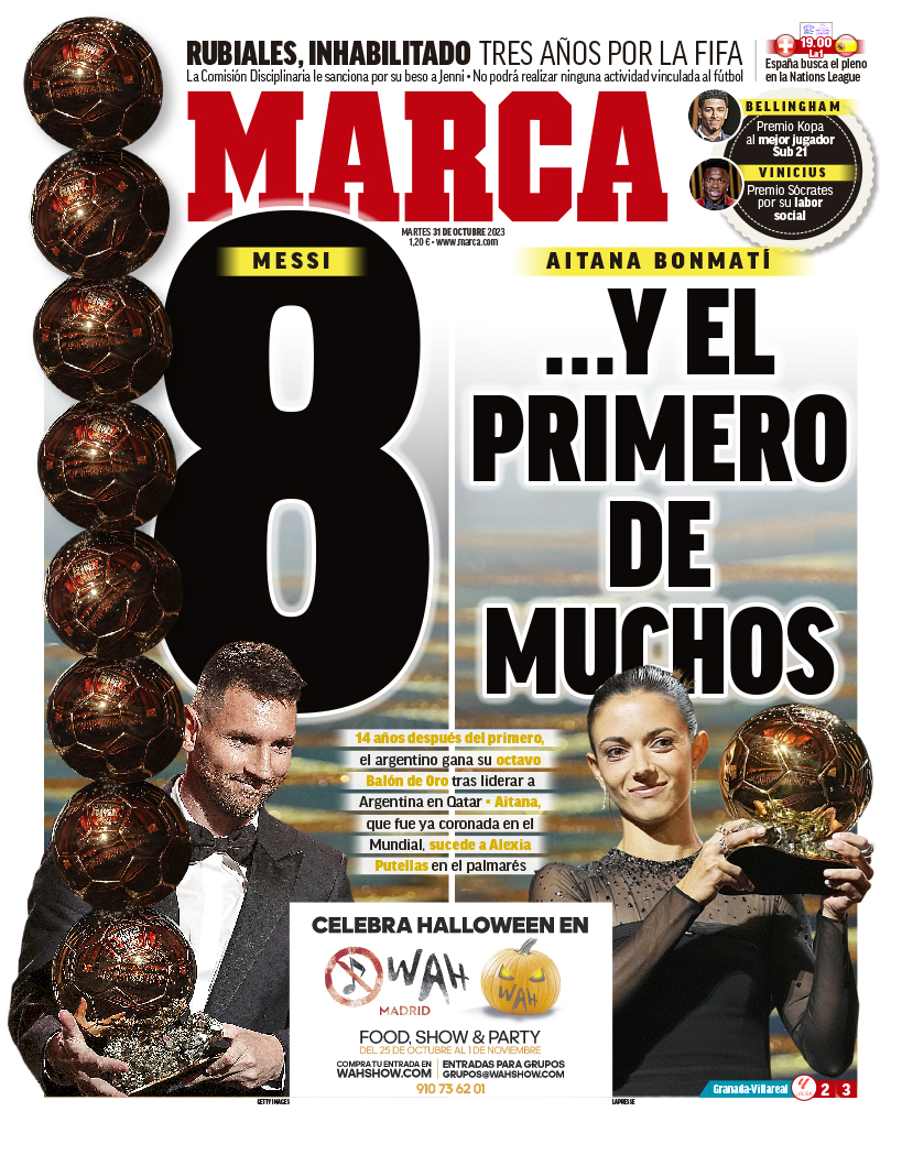 En su edición de este martes, el diario Marca abre con el octavo Balón de Oro de Lionel Messi, el primero de Aitana Bonmatí y con el Trofeo Kopa de Bellingham.