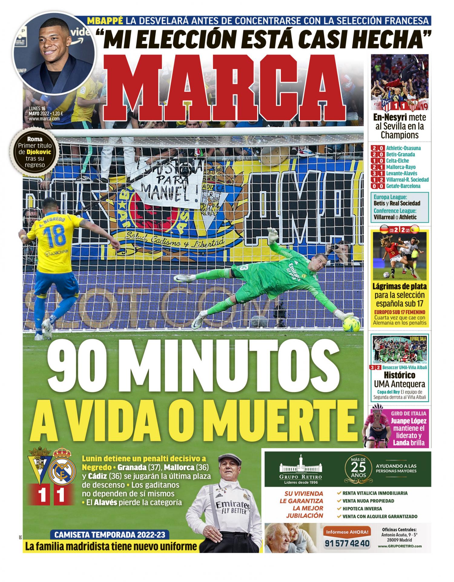 El diario Marca analiza en su portada de hoy el empate del Real Madrid en Cádiz y menciona las declaraciones de Kylian Mbappé acerca de su futuro.