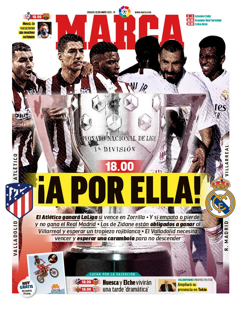 El Marca sale hoy en portada con el final de Liga entre Real Madrid y Atlético de Madrid, los candidatos a hacerse con el título. "A por ella", dice el titular de prensa.