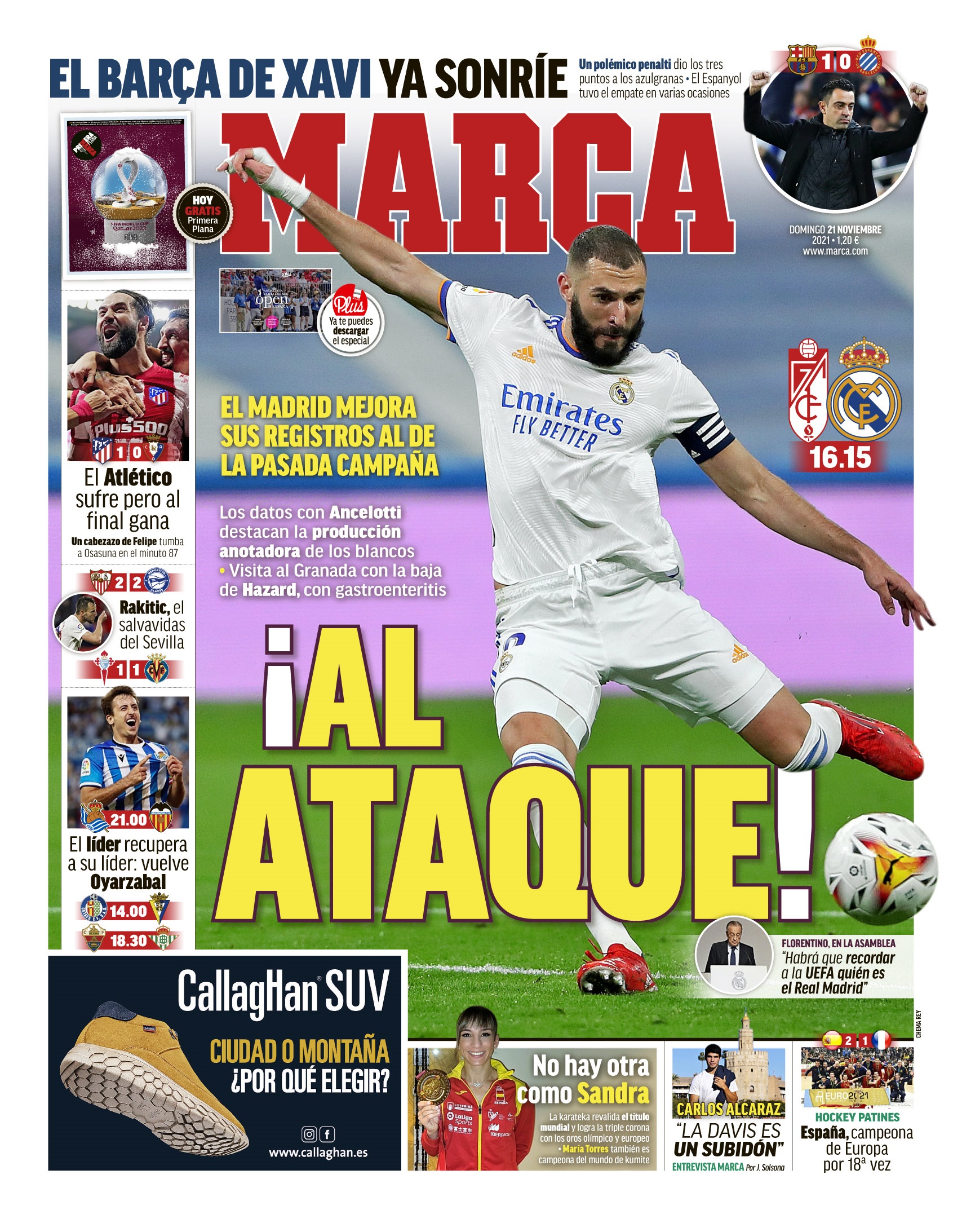 En su portada de este domingo, el diario Marca abre con la mejora goleadora que ha experimentado el Real Madrid con Ancelotti respecto a la pasada temporada. Los blancos visitan al Granada en busca del liderato de LaLiga Santander.