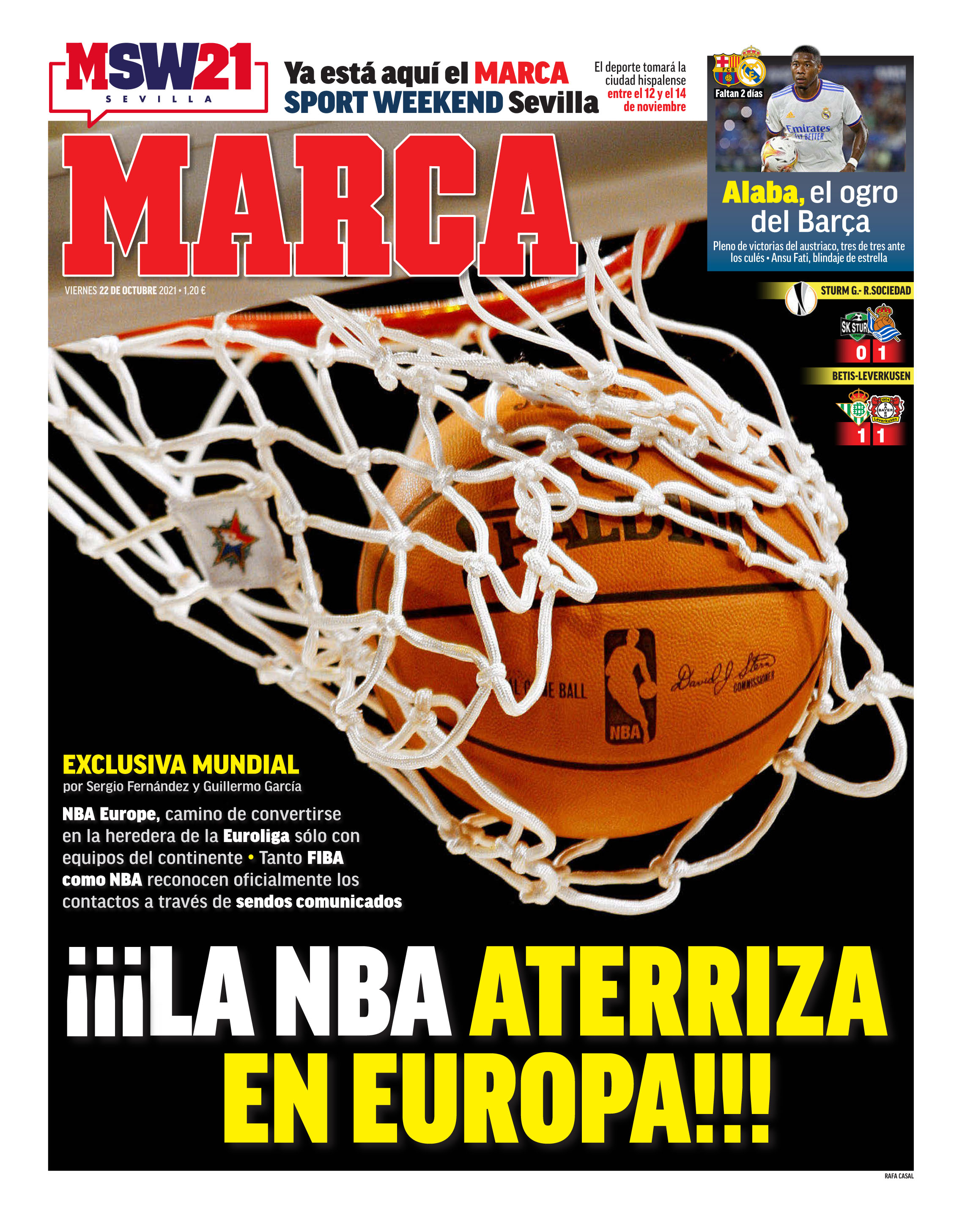 El diario Marca recalca la importancia de David Alaba a favor del Real Madrid en el clásico ante el FC Barcelona del próximo domingo 24 de octubre. Además, destaca en portada que "la NBA aterriza en Europa".