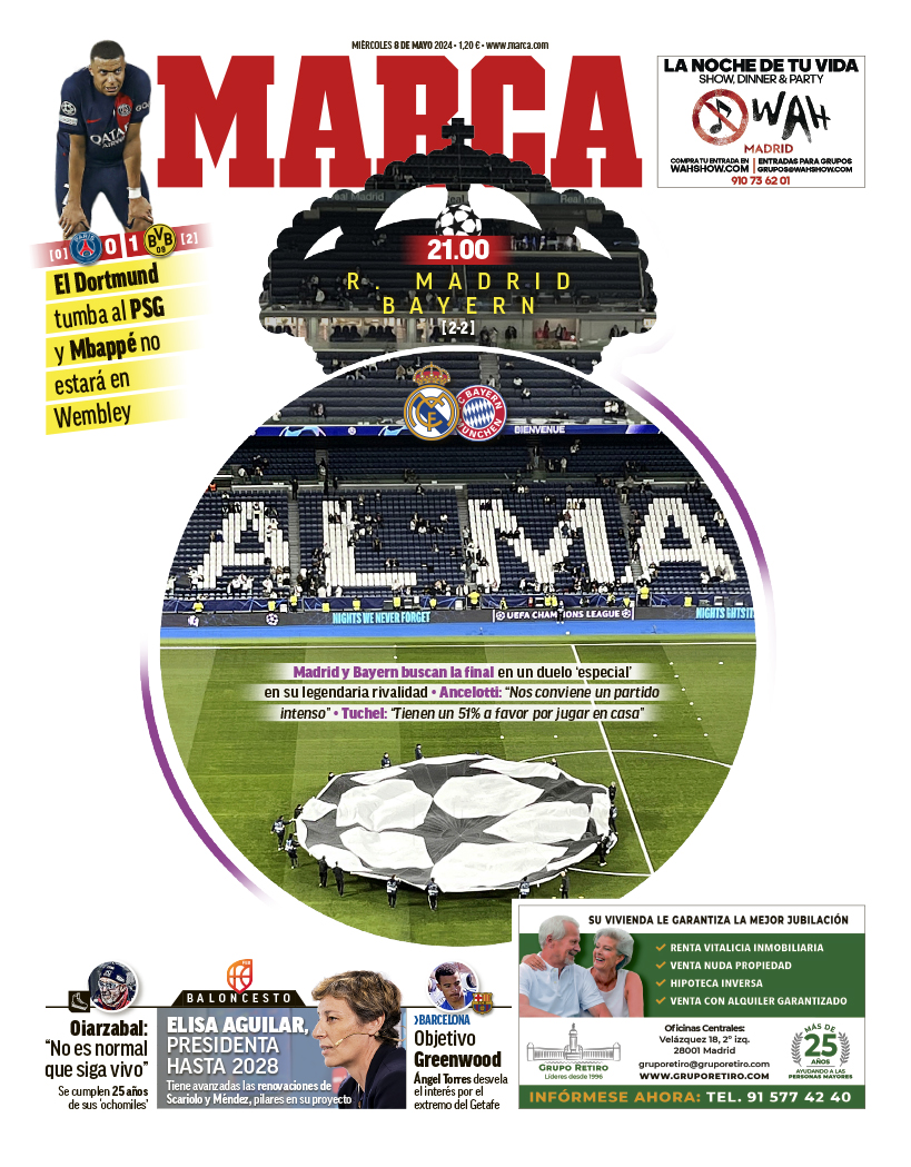 "Alma". El diario Marca hace un juego con las letras de Real Madrid del Santiago Bernabéu para titular su portada de hoy.