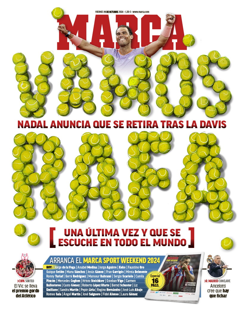 Este viernes 11 de octubre de 2024, el diario Marca saca en portada a Rafa Nadal, que el pasado jueves anunció su retirada del tenis profesional, y a un Carlo Ancelotti que "cree que hay que fichar", según el periódico.