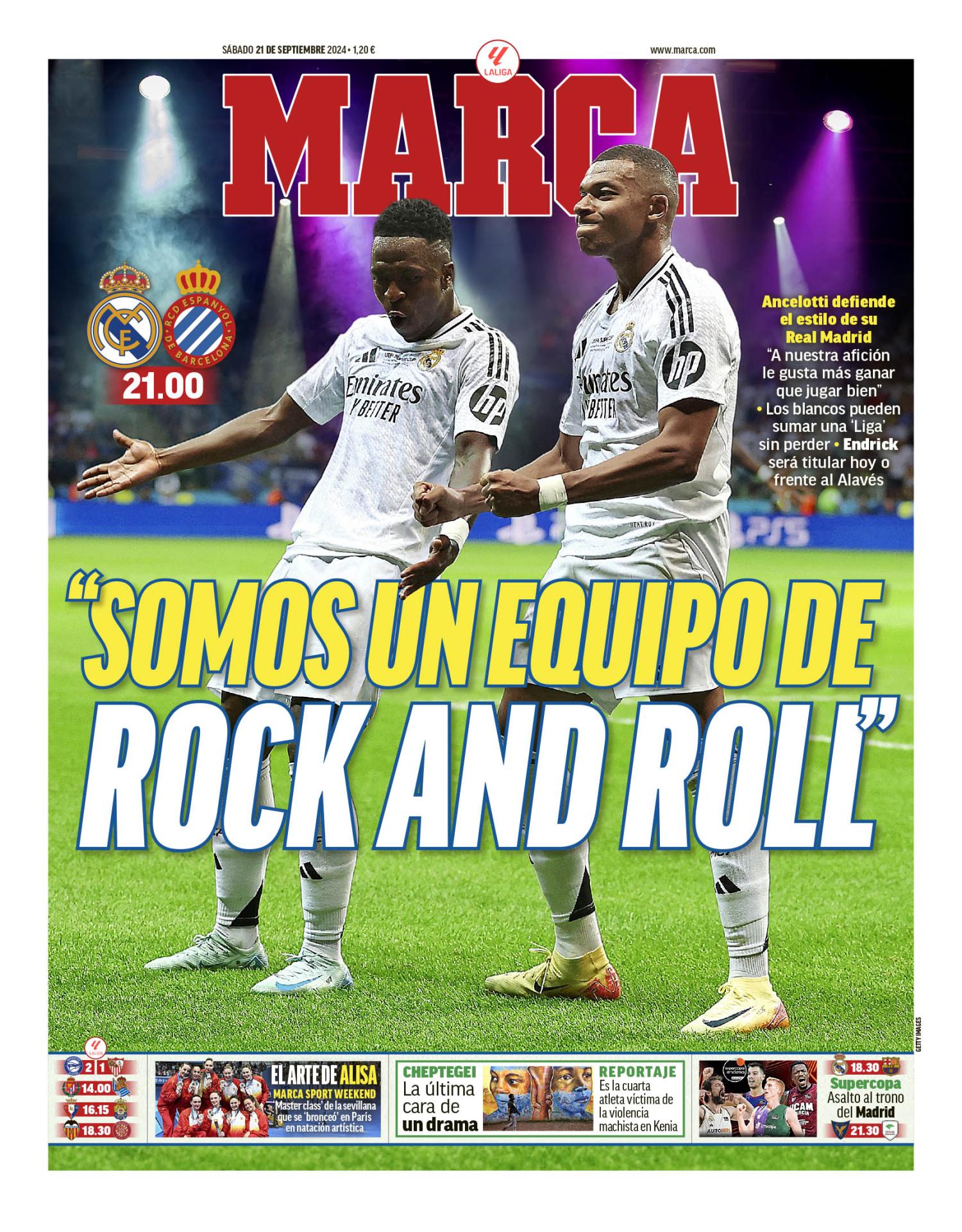 Este sábado 21 de septiembre de 2024, el diario Marca saca en portada las declaraciones de Carlo Ancelotti sobre el fútbol Rock&Roll del Real Madrid.