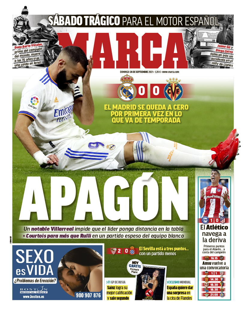 El diario Marca saca hoy en portada el empate del Real Madrid ante el Villarreal que acabó con la buena racha de victorias que llevaba el conjunto merengue al que se le apagaron las luces en ataque contra el submarino amarillo.