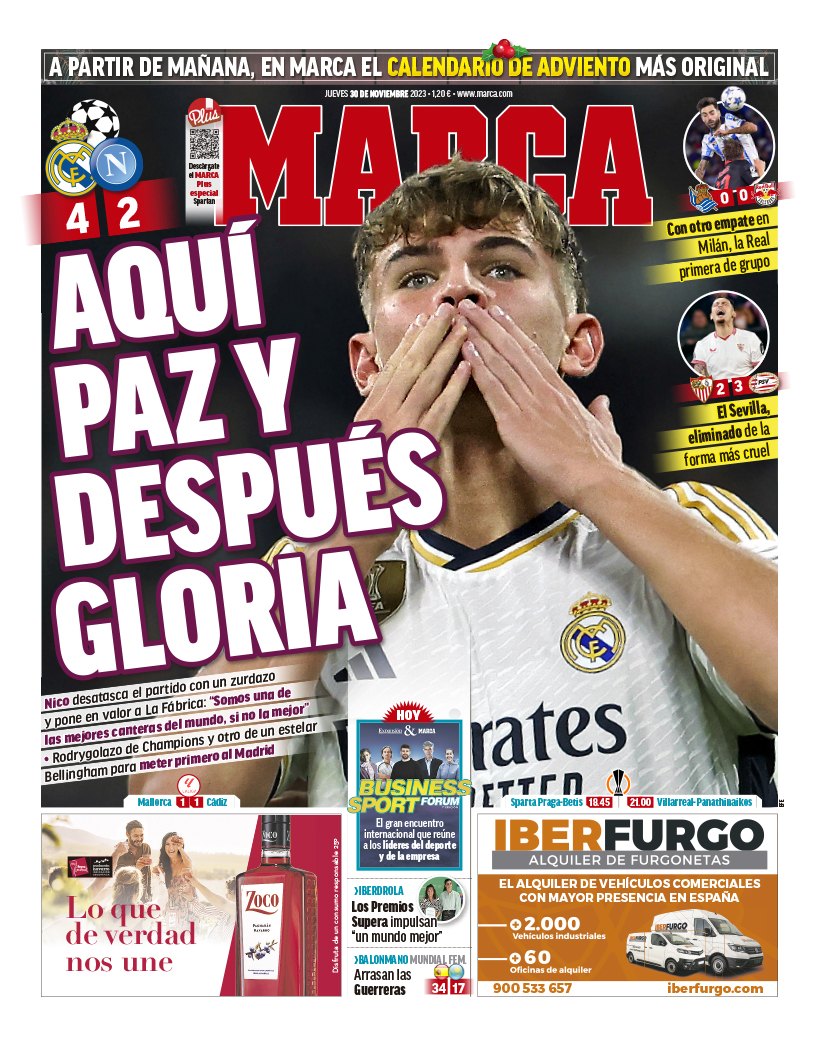 El diario Marca ofrece en su portada de hoy a Nico Paz como el protagonista de la jornada. El tinerfeño anotó su primer gol con el primer equipo del Real Madrid y se llevó los focos en el Santiago Bernabéu en todo un partido de Champions.