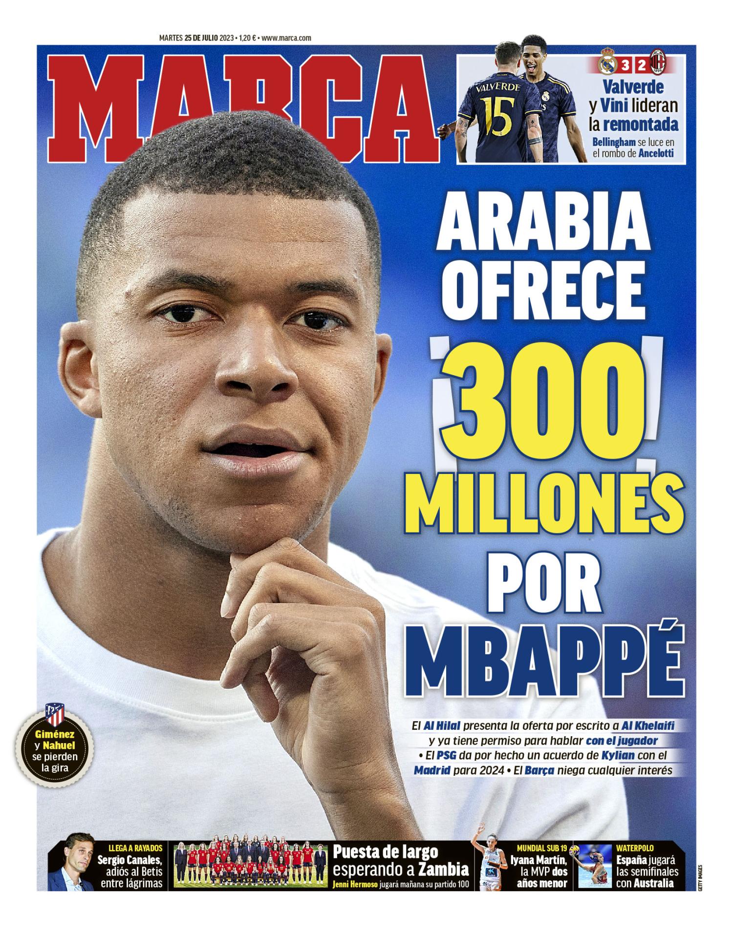 Este martes 25 de julio, el diario Marca saca en portada el ofertón de 300 millones de euros que ha hecho el Al-Hilal saudí por el fichaje de Kylian Mbappé este verano.