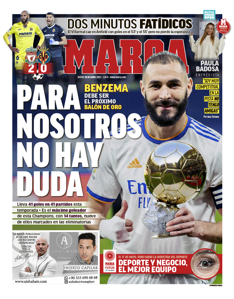 Marca destaca en la parte central de su portada los merecimientos de Karim Benzema para ser el Balón de Oro 2022. El francés suma 41 goles en 41 partidos y es además el máximo goleador de la presente edición de la Champions League con 14 tantos. En la parte superior de la imagen el medio recalca los dos minutos fatídicos del Villarreal contra el Liverpool en Anfield. Los 'reds' dejaron encarrilada la eliminatoria en su propio estadio.