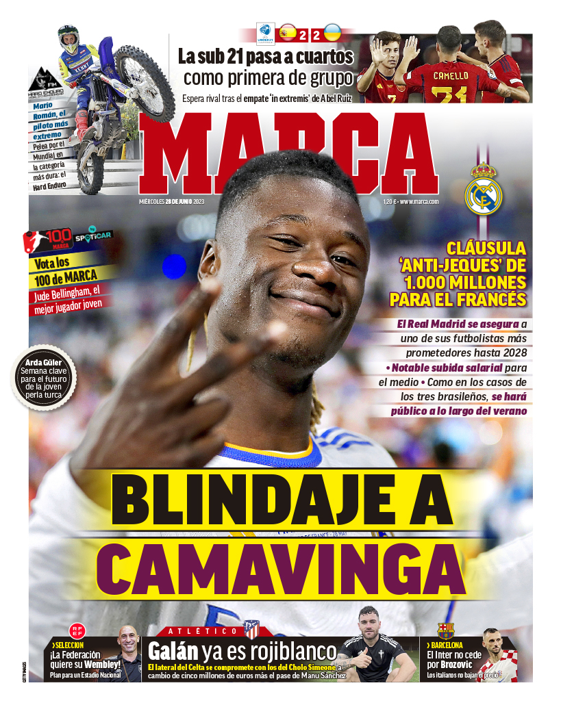 Marca destaca la renovación de Eduardo Camavinga con el Real Madrid. El club merengue se asegura los servicios del internacional francés hasta 2028. Tendrá una cláusula de 1.000 millones de euros para que los jeques no intenten hacerse con sus servicios.