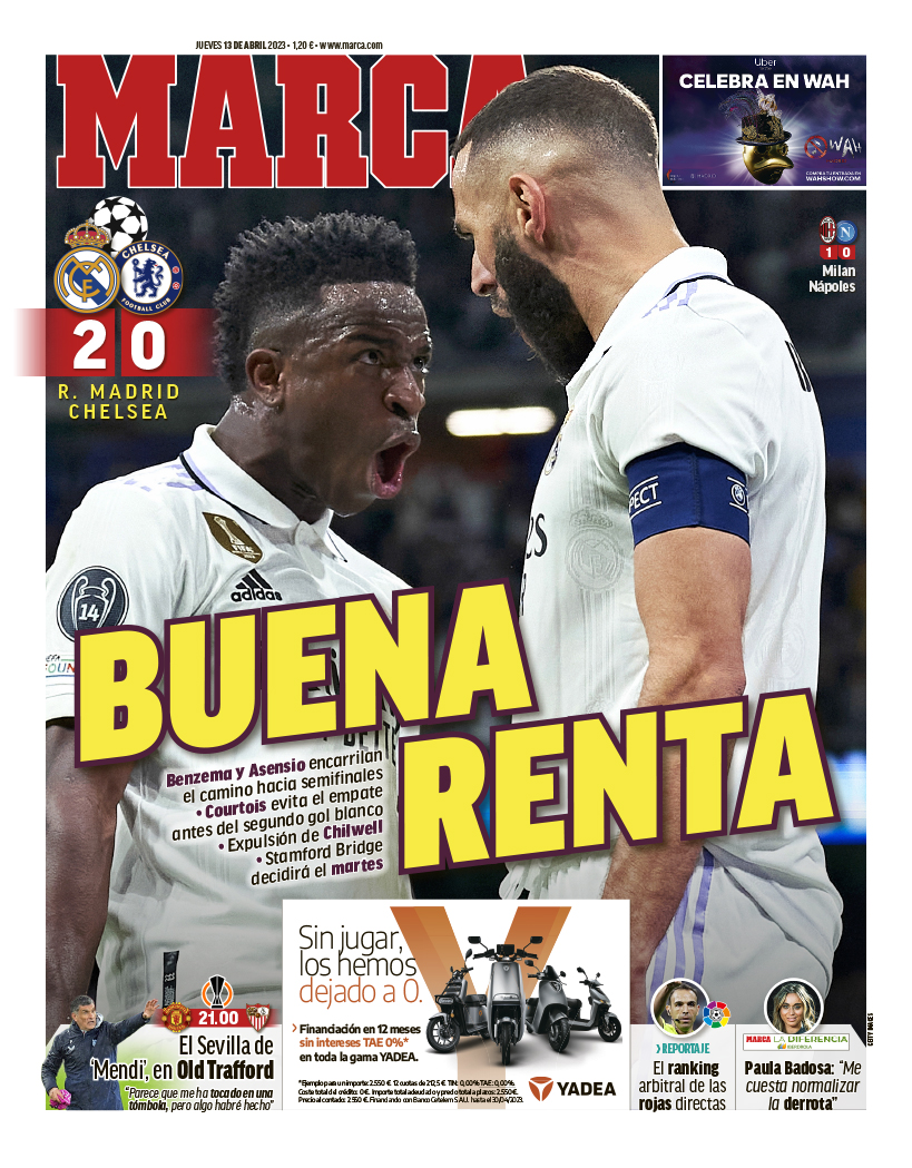 Marca abre con la victoria del Real Madrid ante el Chelsea de Frank Lampard. Los de Ancelotti viajarán hasta Londres con una buena ventaja de la ida, pero tendrán que salir al 100% en Stamford Bridge para no tener sustos.