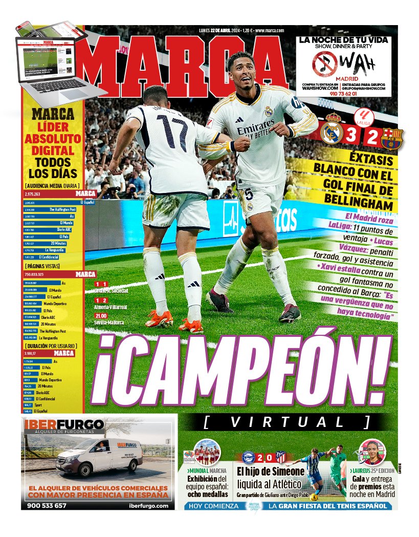 La portada de hoy del diario Marca titula así el clásico entre el Real Madrid y Fútbol Club Barcelona: "¡Campeón! [Virtual]".