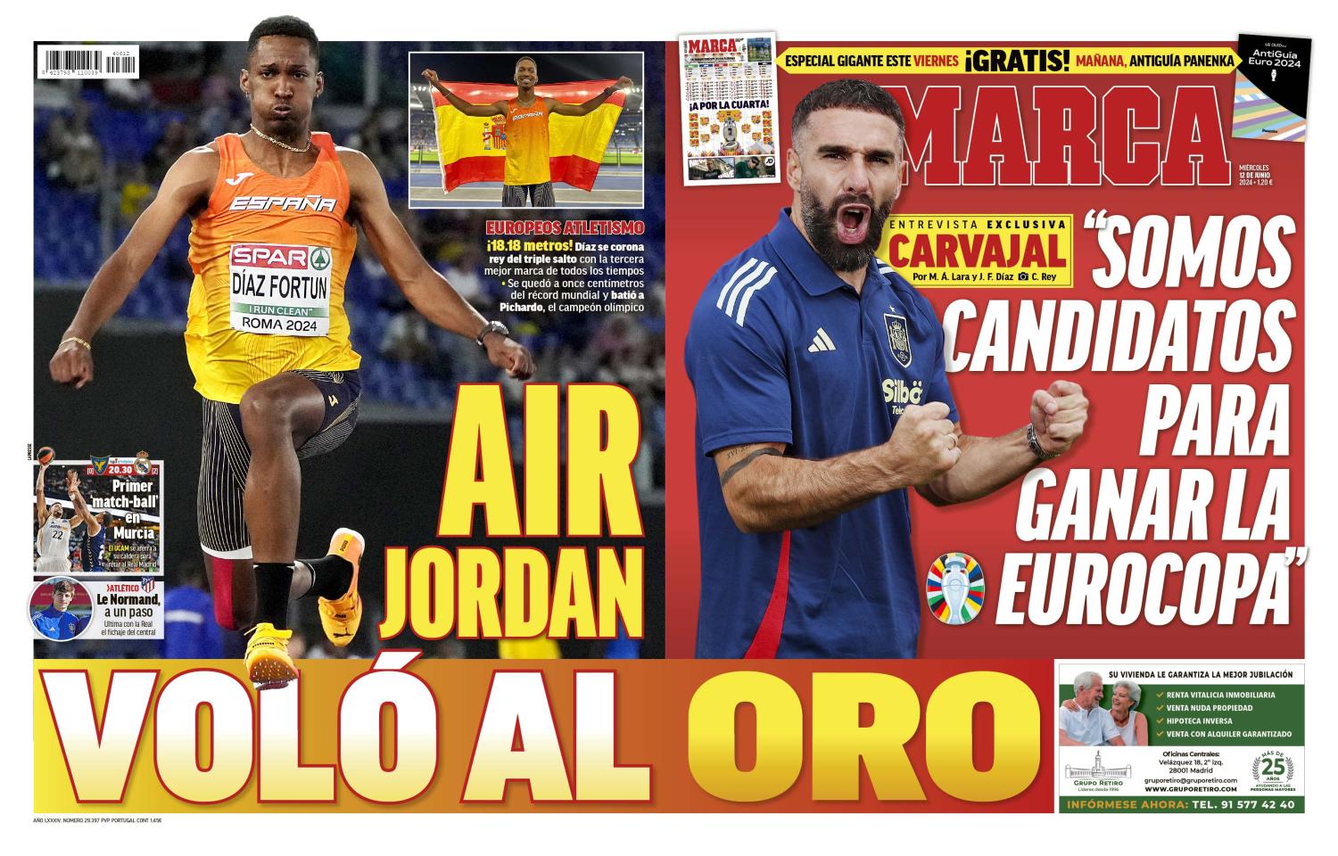 Este miércoles 12 de junio de 2024, el diario Marca saca en portada una entrevista con Dani Carvajal, y destaca también la medalla de oro de Jordan Díaz en el Europeo de Atletismo, en la modalidad de triple salto.