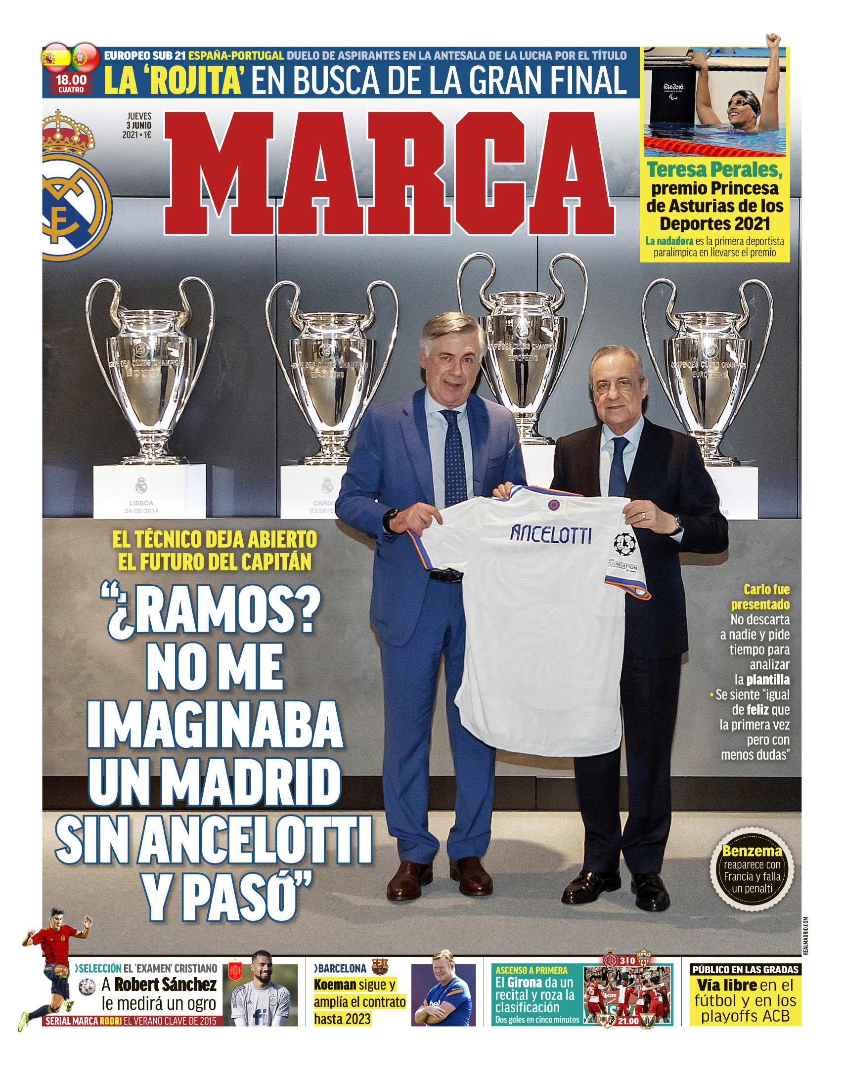 El diario Marca abre su portada del jueves con la presentación de Carlo Ancelotti como nuevo entrenador del Real Madrid. El técnico italiano habló, entre otros muchos temas, del futuro de Sergio Ramos: "No me imaginaba un Madrid sin Ancelotti y pasó", ha señalado 'Carletto'.