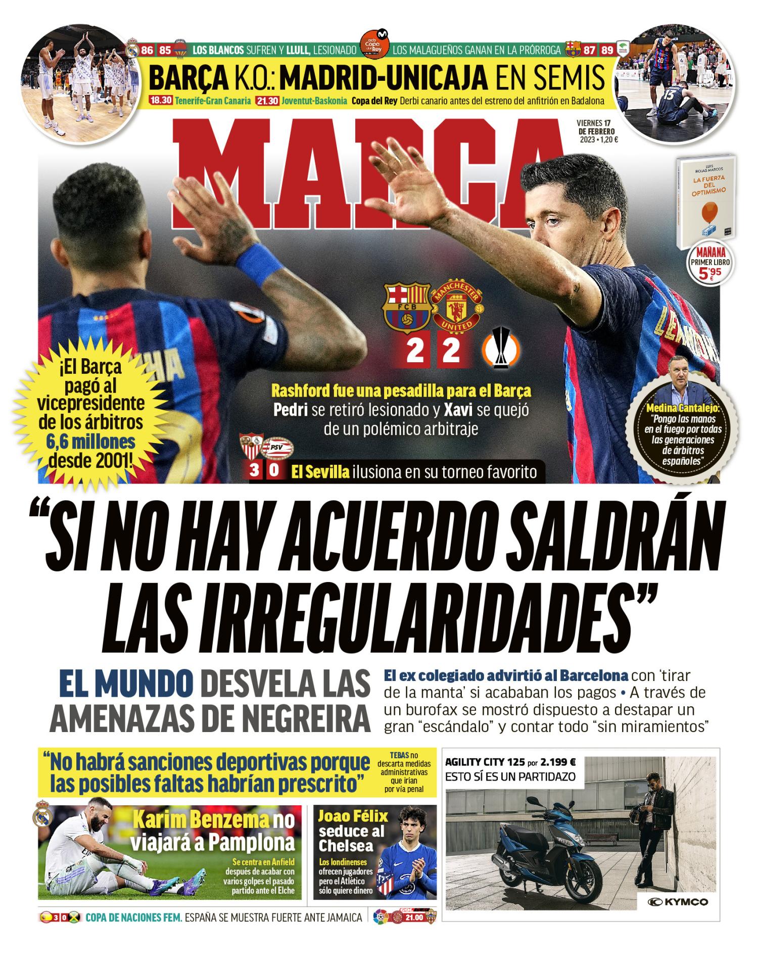 El diario Marca abre su edición matinal del viernes con la exclusiva del periódico El Mundo acerca de las palabras del exvicepresidente del CTA, Enríquez Negreira, en el burofax amenazando al FC Barcelona con sacar las irregularidades a la luz. También destacan la baja de Benzema en el partido del Real Madrid ante Osasuna.