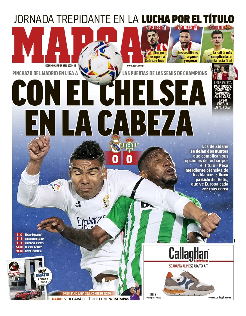 El diario Marca abre su edición de este domingo con el empate entre Real Madrid y Real Betis (0-0) en el Alfredo di Stéfano. El periódico madrileño especula con que el partido contra el Chelsea del próximo martes haya podido distraer al conjunto de Zidane.