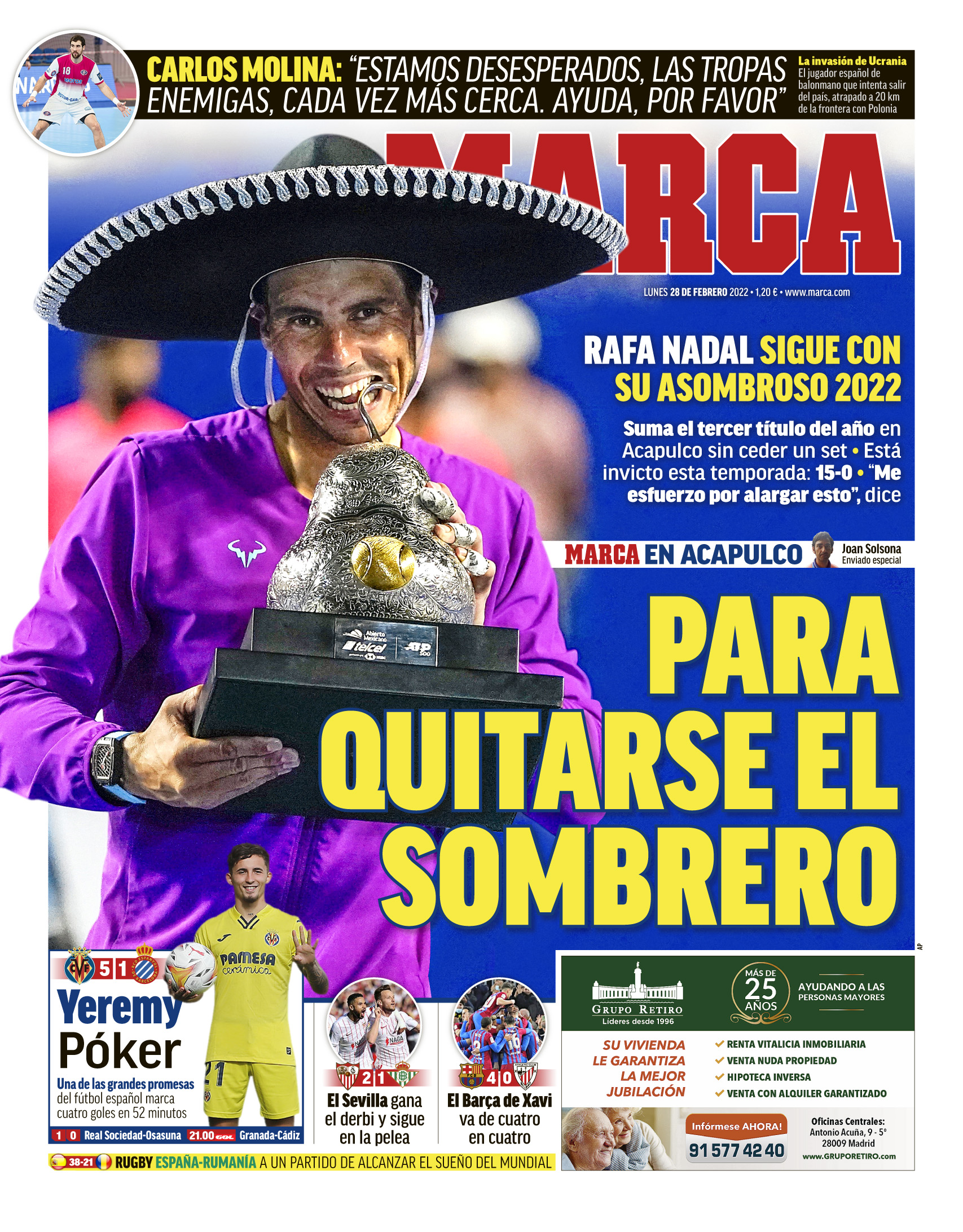 El diario Marca presenta en su portada de hoy a Rafa Nadal debido a su victoria en Acapulco: "Rafa Nadal sigue con su asombroso 2022", reza el subtítulo.