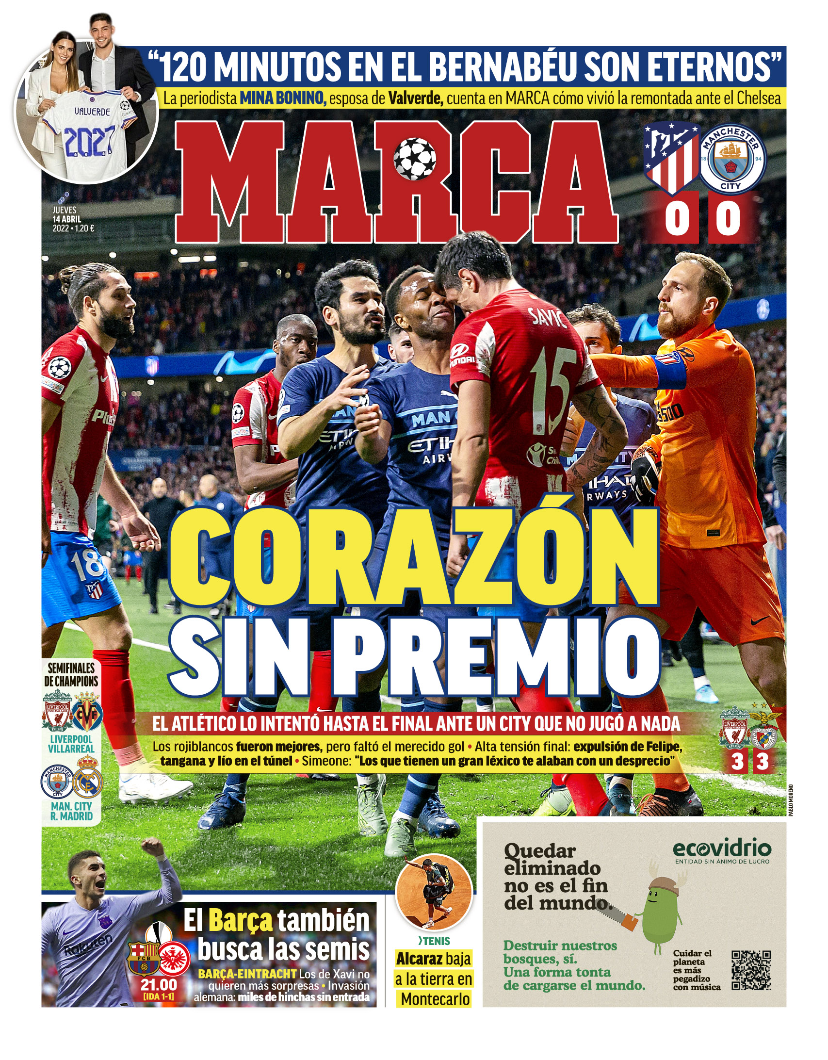Marca destaca el gran partido del Atlético de Madrid tras apabullar al Manchester City en el Wanda Metropolitano. Los de Simeone se merecieron al menos jugar la prórroga, pero la suerte les fue esquiva y serán los de Pep Guardiola los que jueguen contra el Real Madrid en las semifinales de la Champions League.
