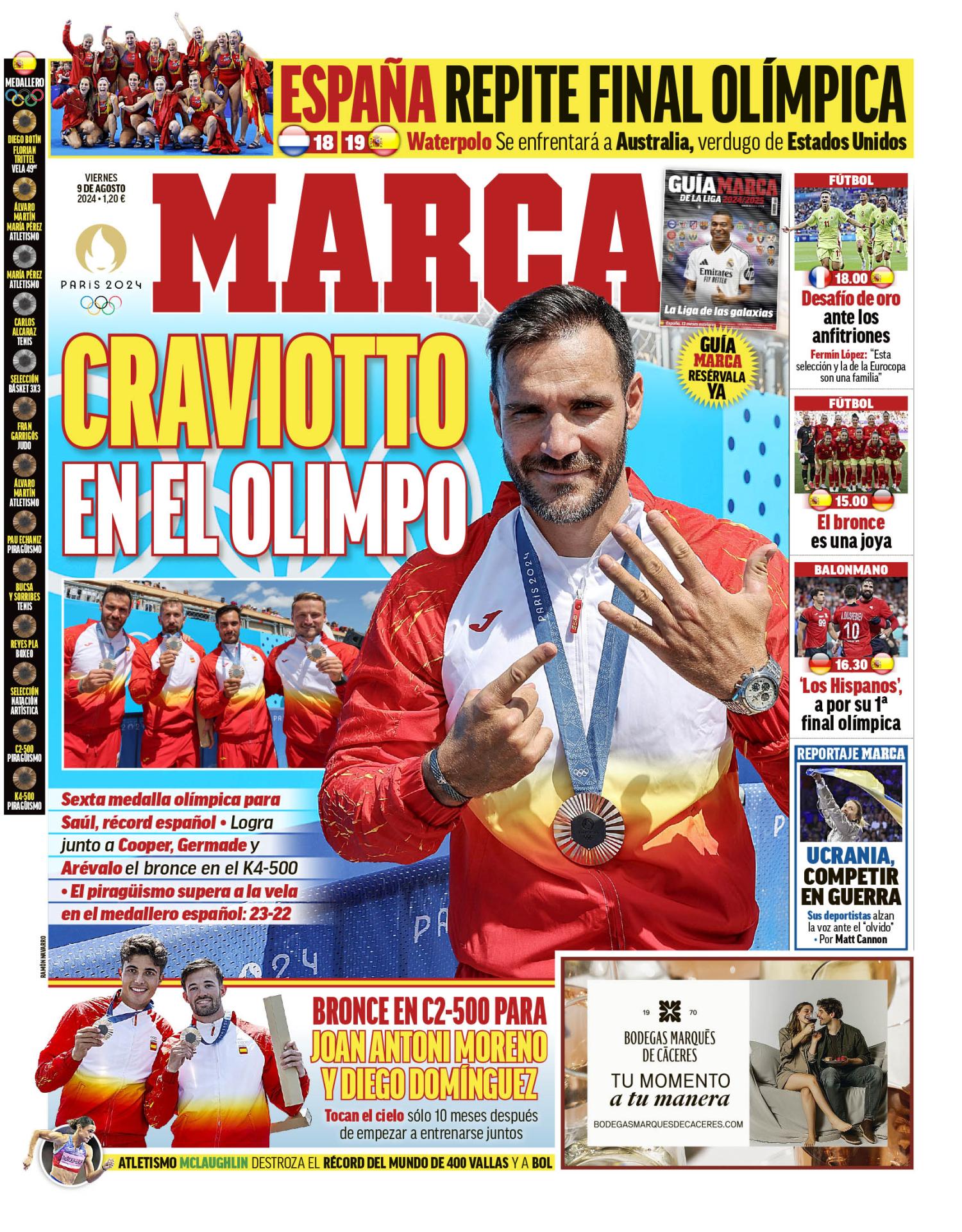 Este viernes 9 de agosto de 2024, el diario Marca saca en portada la sexta medalla olímpica de Saúl Craviotto, tras su nuevo bronce en el K4-500.