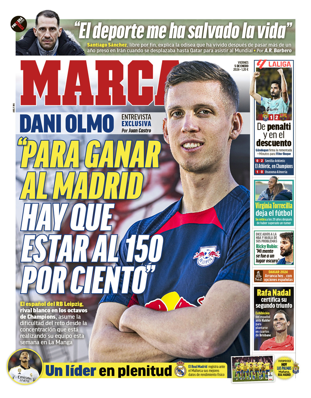 Este viernes 5 de enero, el diario Marca saca en portada una entrevista con Dani Olmo, jugador del Leipzig, próximo rival del Real Madrid en la Champions.