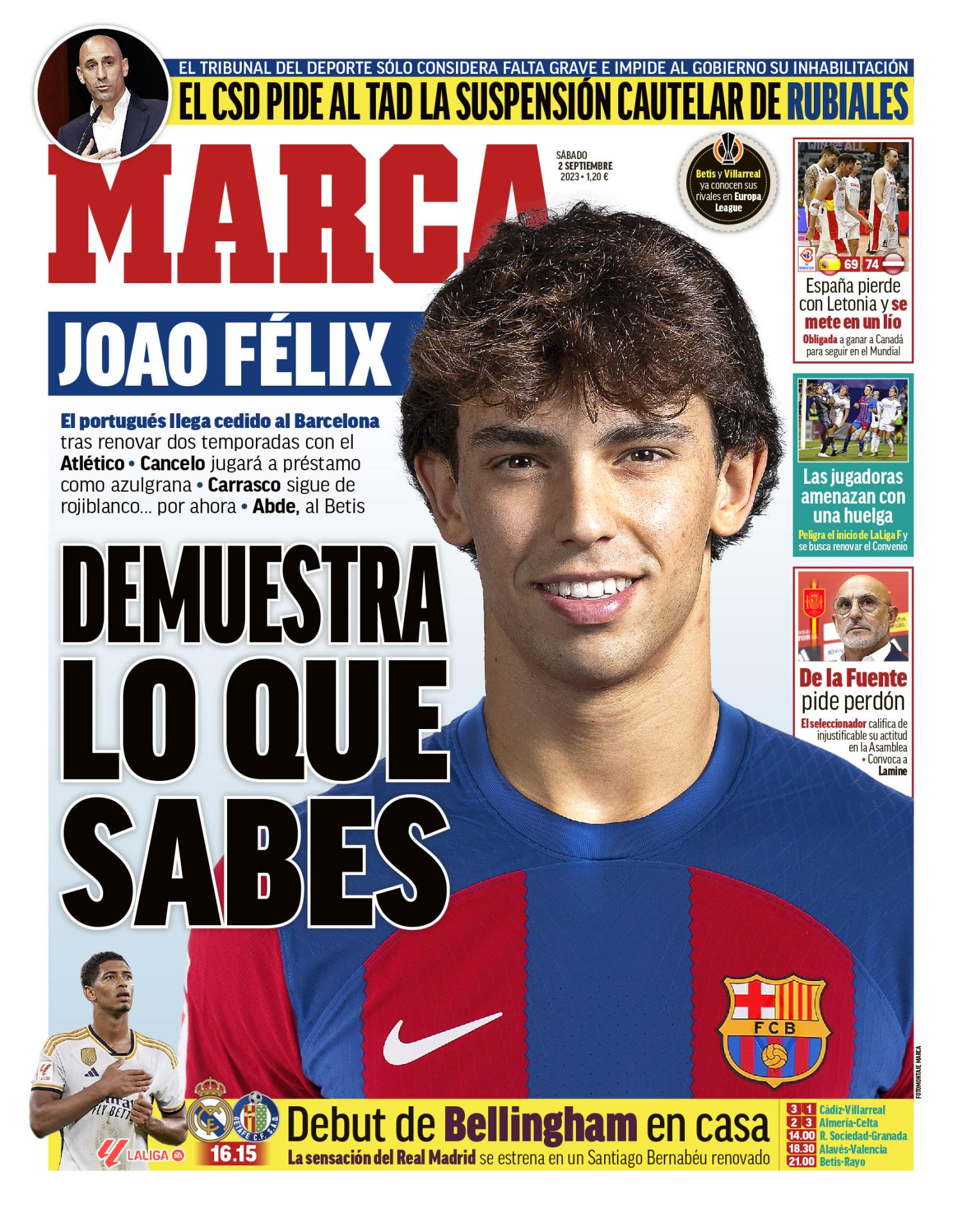 El diario Marca destaca en su portada la previa del Real Madrid - Getafe y las últimas operaciones del mercado de fichajes en la Liga EA Sports, destacando la cesión de Joao Félix al Barça.