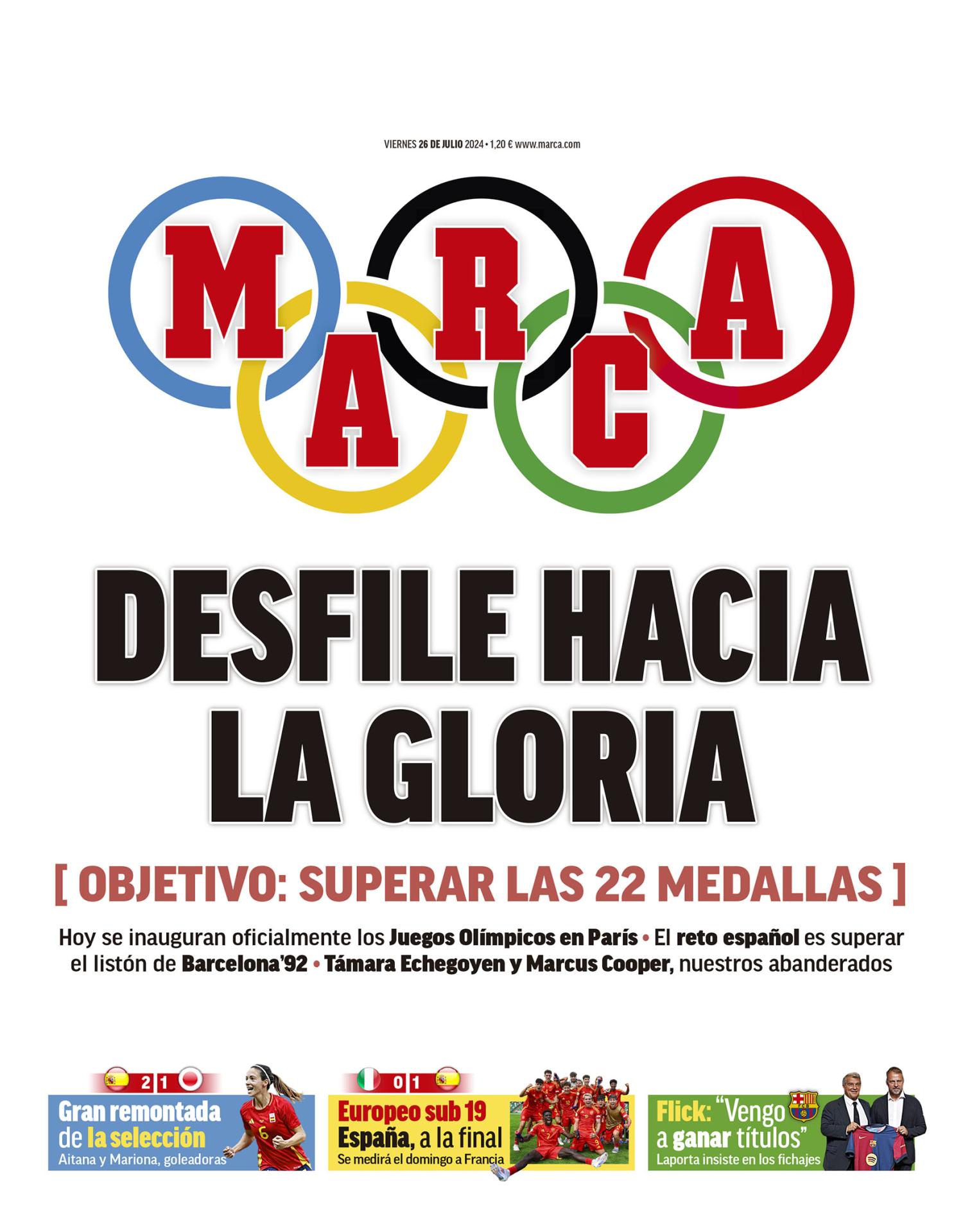 Este viernes 26 de julio de 2024, el diario Marca destaca en su portada la ceremonia inaugural de los Juegos Olímpicos de París que tendrá lugar esta tarde a partir de las 19:30 horas.