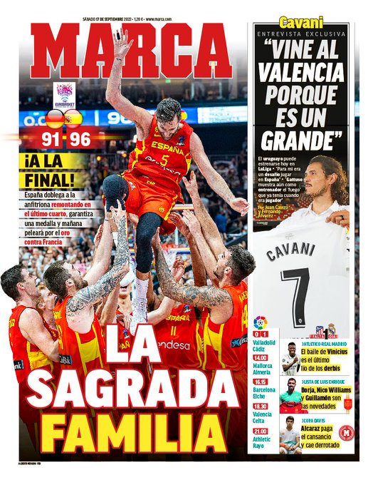 En su edición de este sábado, la portada del diario Marca viene protagonizada por la clasificación de la España de baloncesto para la final del Eurobasket tras vencer en la semifinal a Alemania.