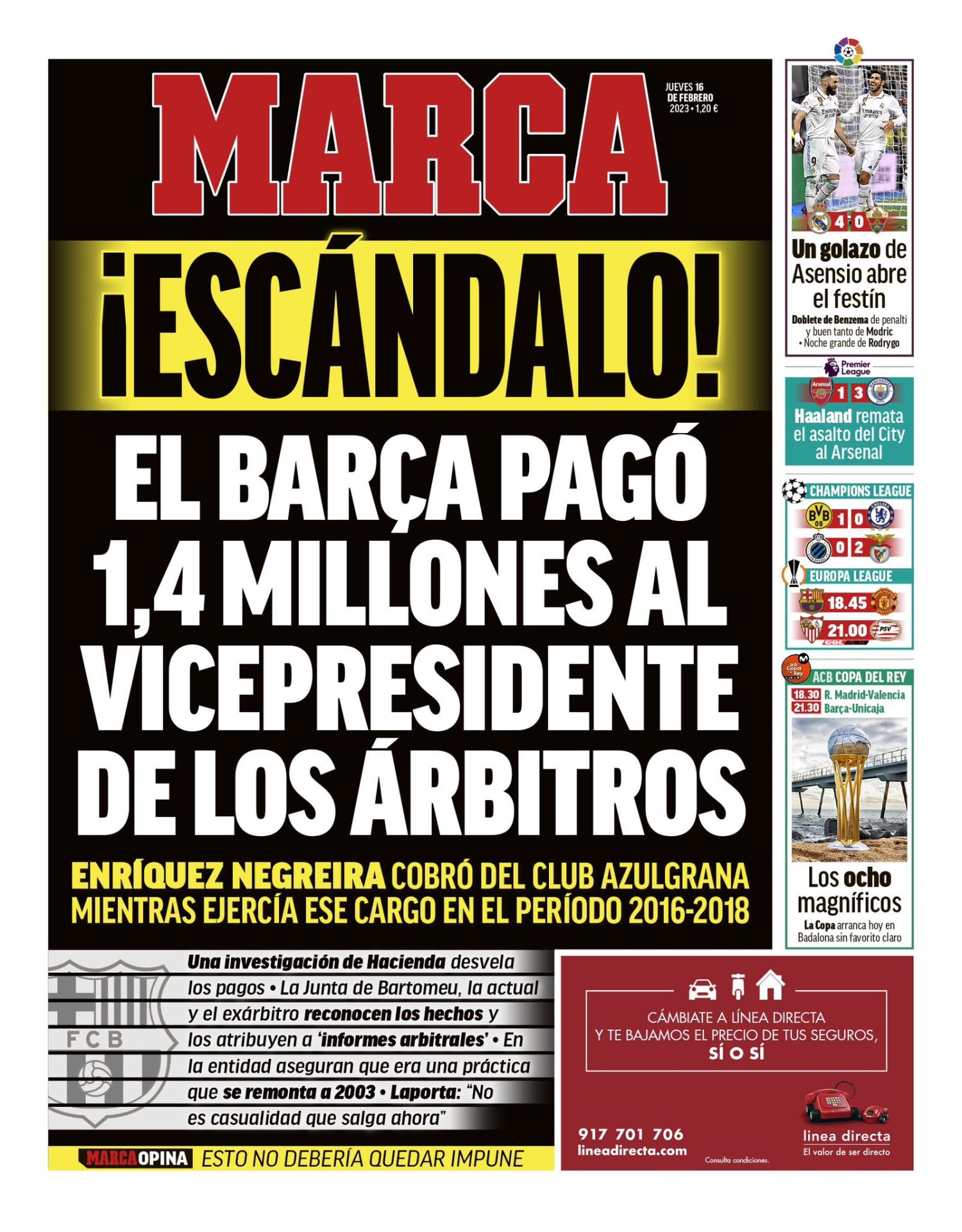 Marca destaca el escándalo del FC Barcelona tras los pagos realizados al vicepresidente del Comité Técnico de Árbitros en los años 2016, 2017 y 2018. Según el informe realizado sobre el asunto, los blaugrana "querían que los árbitros tomasen decisiones neutrales".