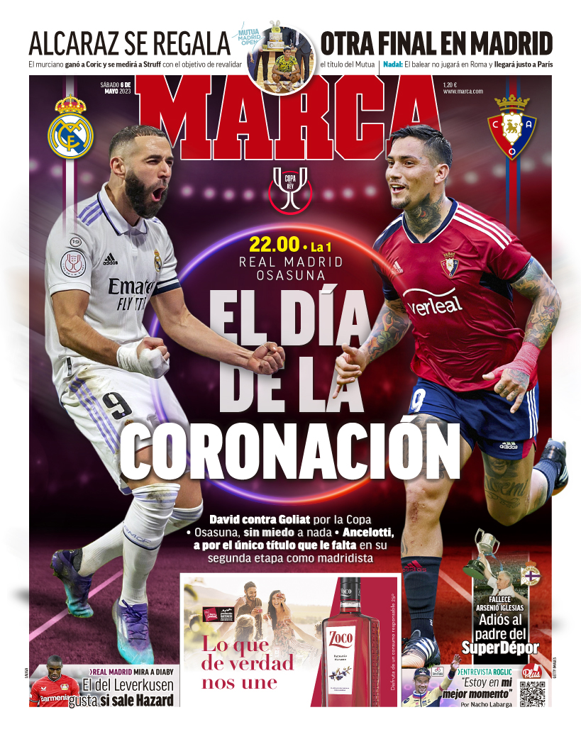 La portada de hoy del diario Marca se titula: "El día de la coronación", haciendo el doble juego entre la final de la Copa del Rey entre Real Madrid y Osasuna y la coronación de Carlos III como rey de Reino Unido.