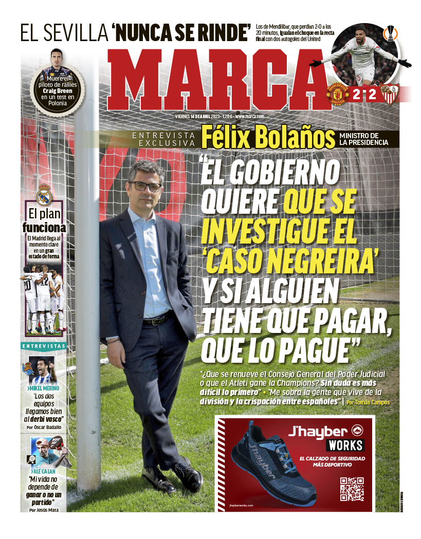 En su edición de este viernes, la portada del diario Marca viene protagonizada por Félix Bolaños, ministro de la Presidencia de España: "El Gobierno quiere que se investigue el 'Caso Negreira' y si alguien tiene que pagar, que pague", ha señalado.