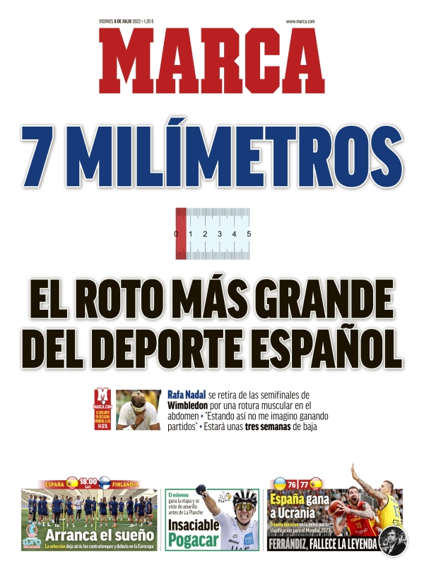 La portada de hoy del diario Marca destaca la renuncia de Rafa Nadal a continuar en Wimbledon por su lesión en el abdomen. Además, recuerdan el fallecimiento de Pedro Ferrándiz, el que fuera entrenador del Real Madrid de baloncesto.