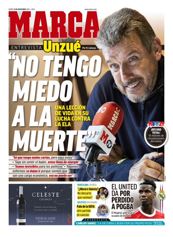 El diario Marca publica este jueves una entrevista con Juan Carlos Unzué. Conocido exfutbolista y extécnico del fútbol español que ha sido diagnosticado con ELA, una de las enfermedades más devastadoras en la actualidad: "No tengo miedo a la muerte. Sé que tengo malas cartas, pero aquí estoy". También añade una información sobre Paul Pogba en la que se asegura que el Manchester United da por perdido a Paul Pogba y el Real Madrid está muy atento a su situación.
