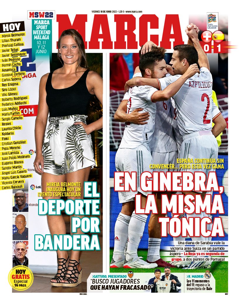 El diario Marca saca este viernes en portada la inauguración del Marca Sport Weekend Málaga con Mireia Belmonte, y también destaca la victoria de España frente a Suiza en la tercera jornada de la Nations League.