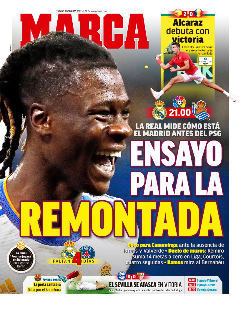 El diario Marca saca en su portada a Camavinga como protagonista antes del partido frente a la Real Sociedad de mañana a las 21:00 horas. Ante la ausencia de Valverde por gripe y Kroos por la microrrotura, el francés gana enteros para ser titular. Courtois lleva cuatro porterías a cero seguidas, mientras que Remiro lleva 14 en total, siendo esto un duelo colosal en ambas porterías.