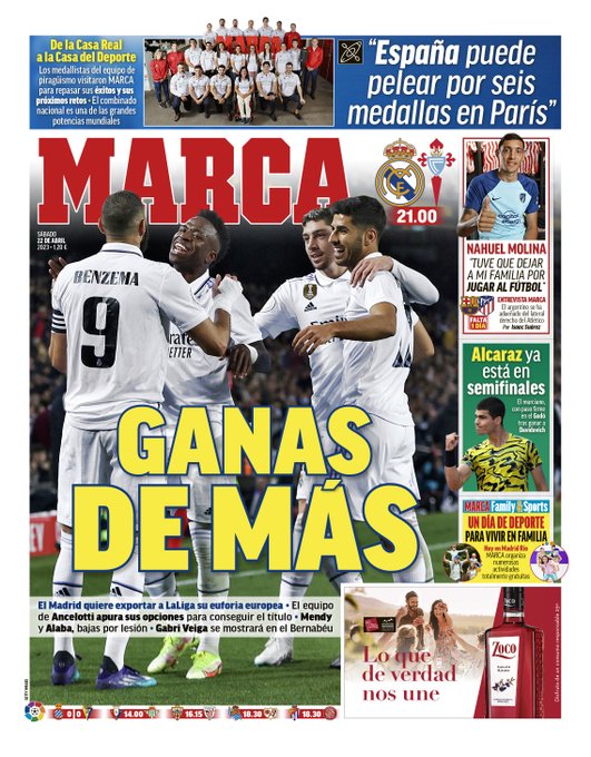 El diario Marca sale este sábado en portada con el duelo del Real Madrid ante el Celta y la ambición del conjunto blanco para seguir cosechando buenos resultados también en LaLiga. Los de Ancelotti jugarán ante el conjunto gallego a las 21:00h en el Santiago Bernabéu.