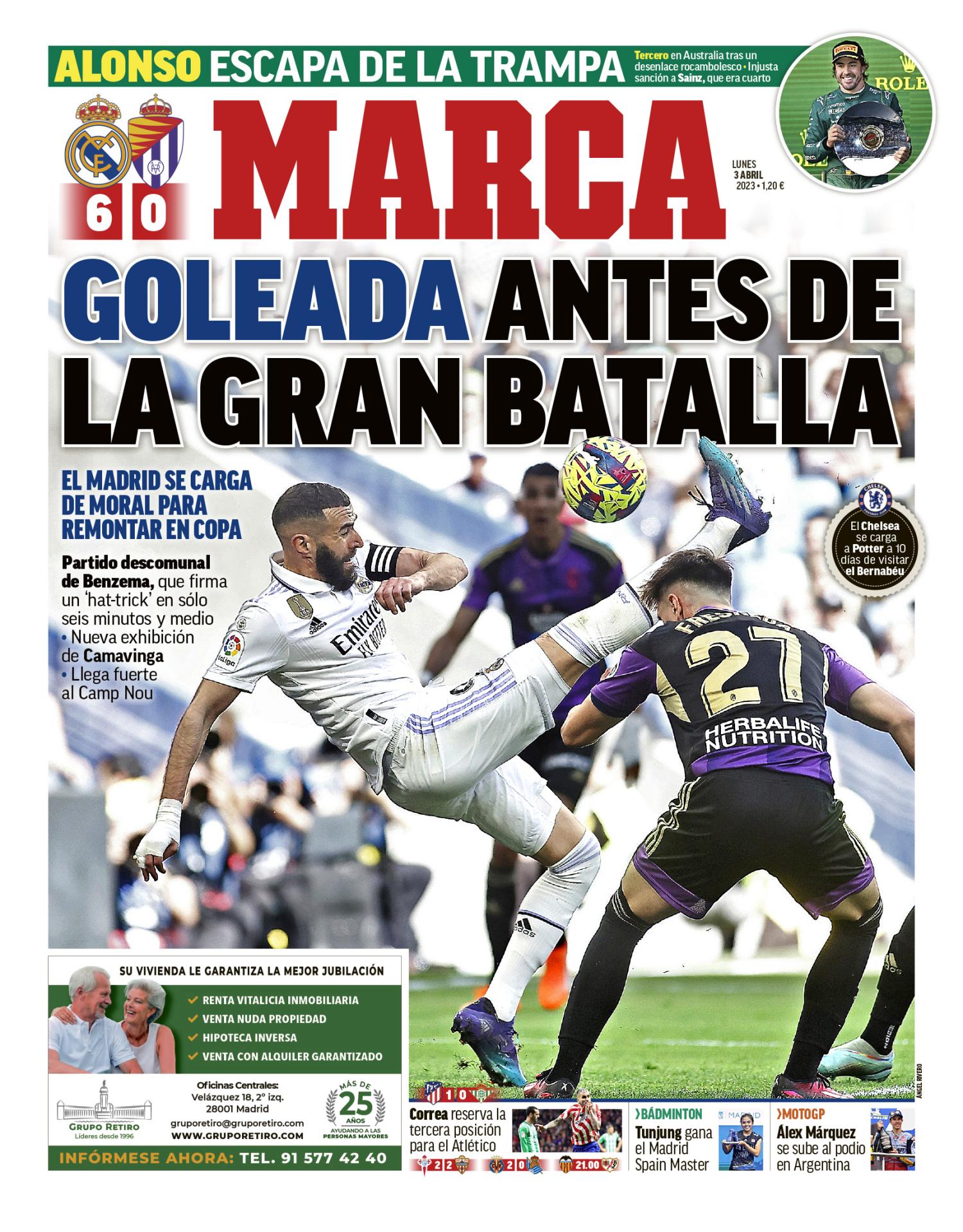 La portada de hoy del diario Marca destaca la goleada del Real Madrid ante el Real Valladolid: "Goleada antes de la gran batalla".