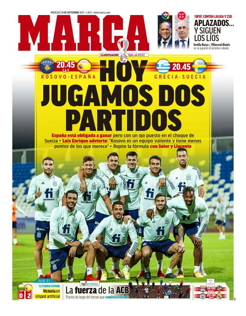 El diario Marca saca en su portada para este miércoles el partido de la selección española en Kosovo (20:45 horas / La1) y el Grecia-Suecia. España se juega tener opciones de clasificarse directamente para el Mundial de Qatar y necesita ganar y que Suecia pinche para depender de sí misma.