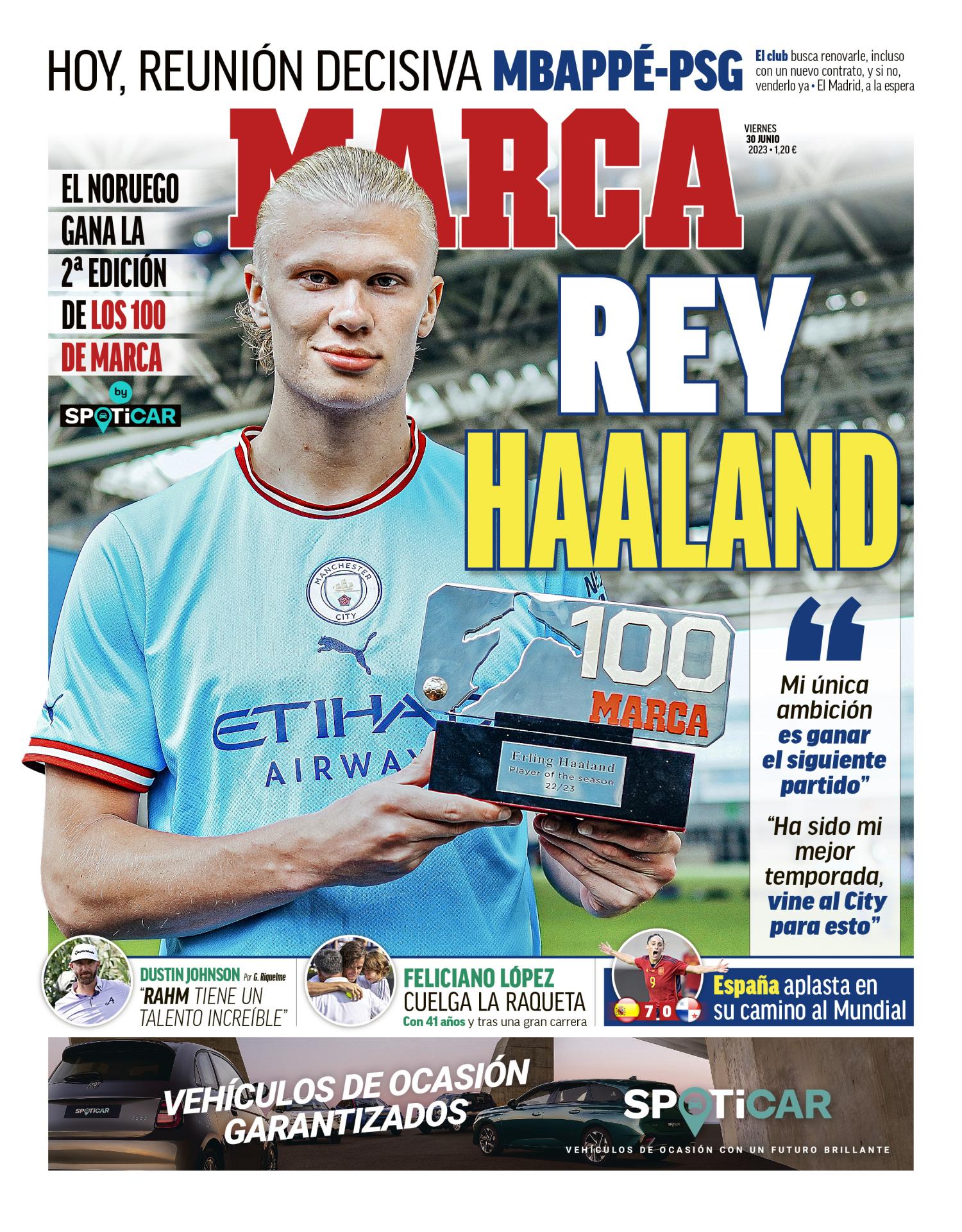 La portada del viernes del diario Marca viene portagonizada por Erling Haaland, que ha ganado la 2ª edición de 'Los 100 de Marca'. Asimismo, destaca la "reunión decisiva" que se avecina entre Kylian Mbappé y el PSG.
