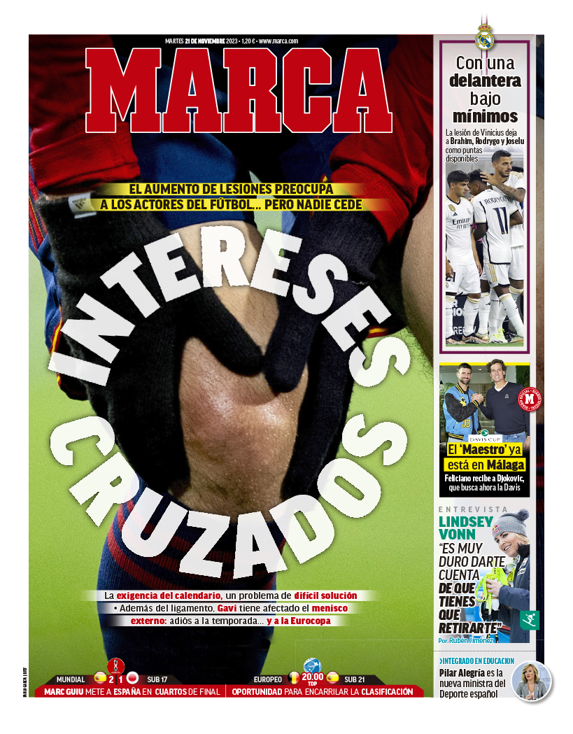 En su edición de este martes, la portada del diario Marca viene protagonizada por la plaga de lesiones que está habiendo en este parón de selecciones.