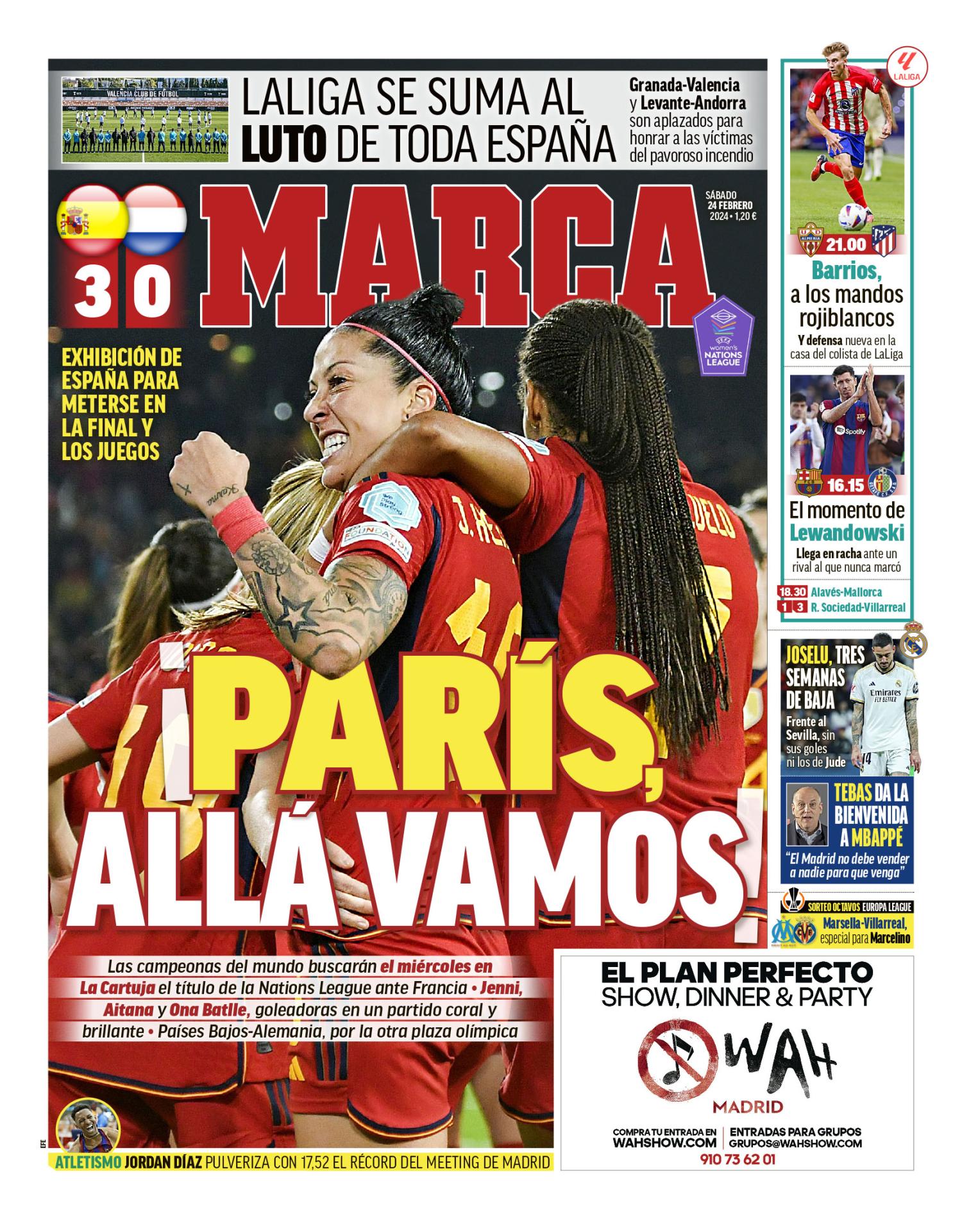 Este sábado 24 de febrero, el diario Marca saca en portada la victoria de la selección española de fútbol femenino frente a Países Bajos, y su consiguiente clasificación para los Juegos Olímpicos. Asimismo, el periódico también destaca la lesión de Joselu.
