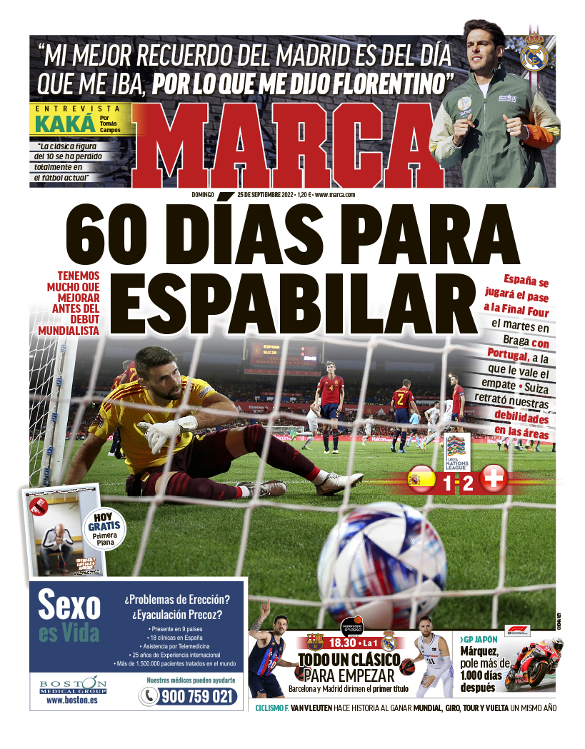 En su edición dominical, la portada del diario Marca destaca la derrota de la Selección Española ante Suiza (1-2): "60 días para espabilar", titula el periódico madrileño.