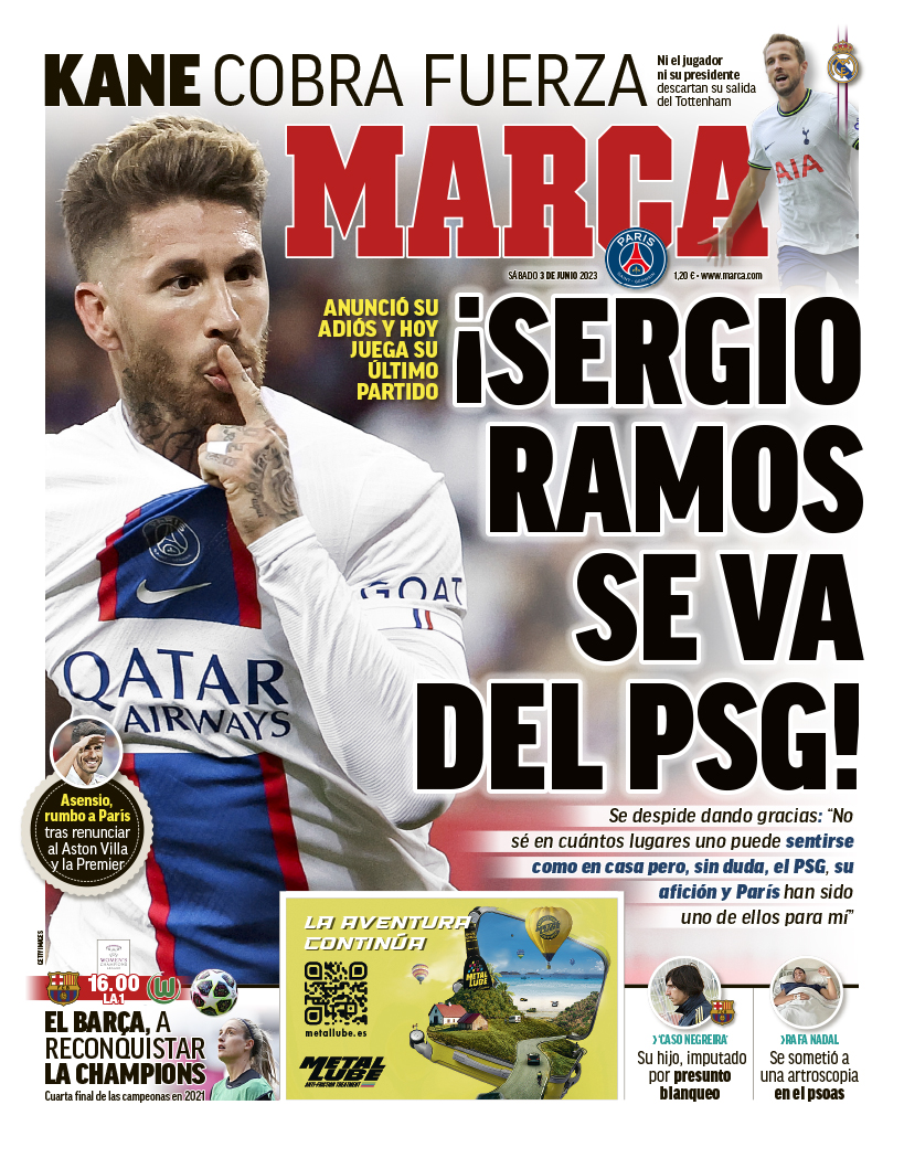 El diario Marca presenta en su portada de hoy el adiós de Sergio Ramos al PSG. Asimismo, Harry Kane se acerca al Real Madrid, mientras que Marco Asensio estaría a un paso del PSG.