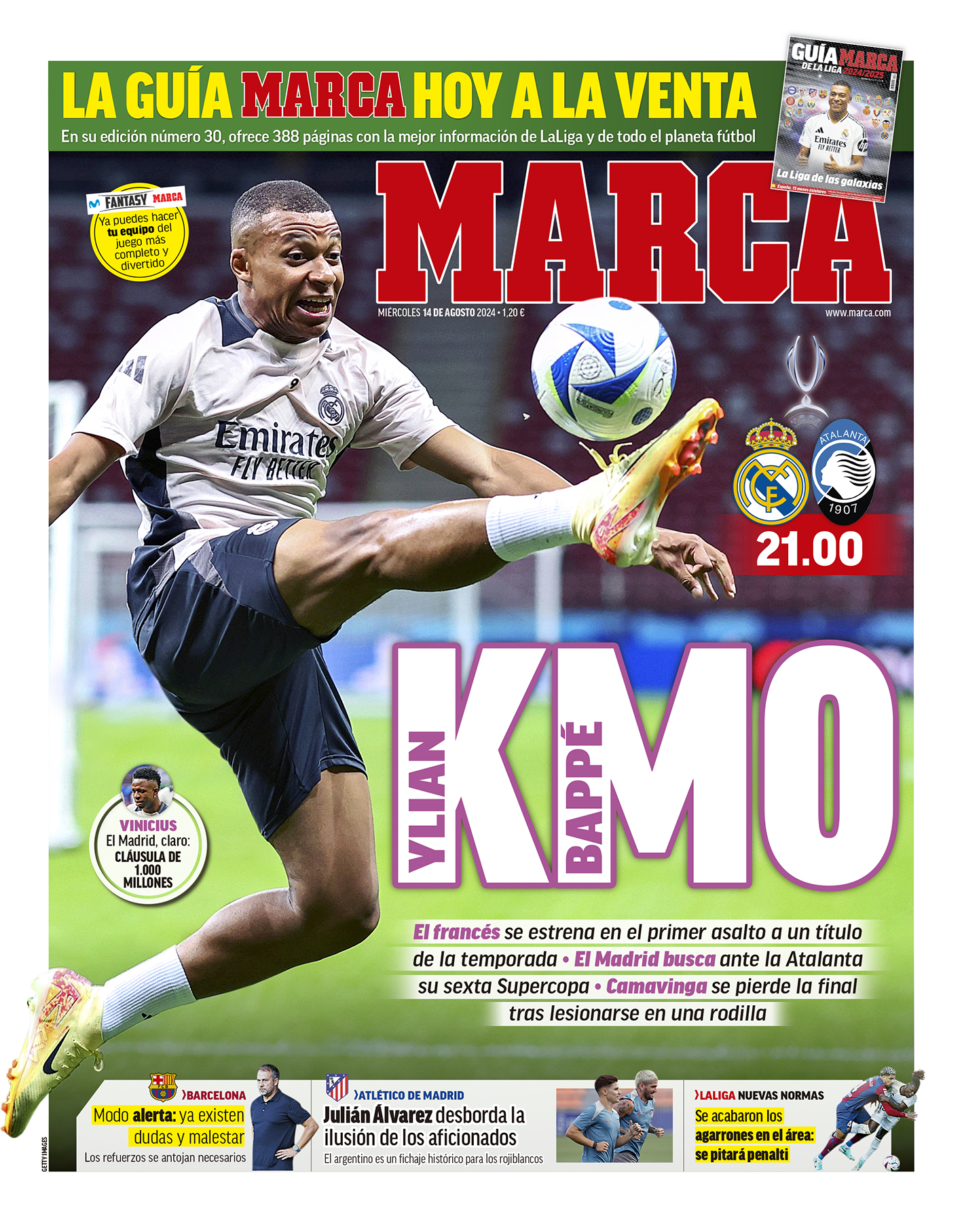 El diario Marca destaca en su portada a Kylian Mbappé, el cual debutará esta noche con el Real Madrid en la final de la Supercopa de Europa.