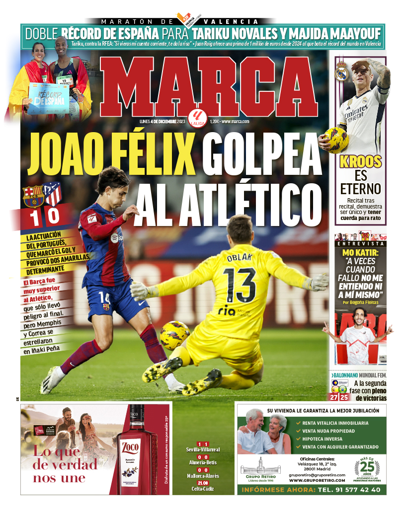 En su edición de este lunes, la portada del diario Marca viene protagonizada por el FC Barcelona 1-0 Atlético de Madrid.