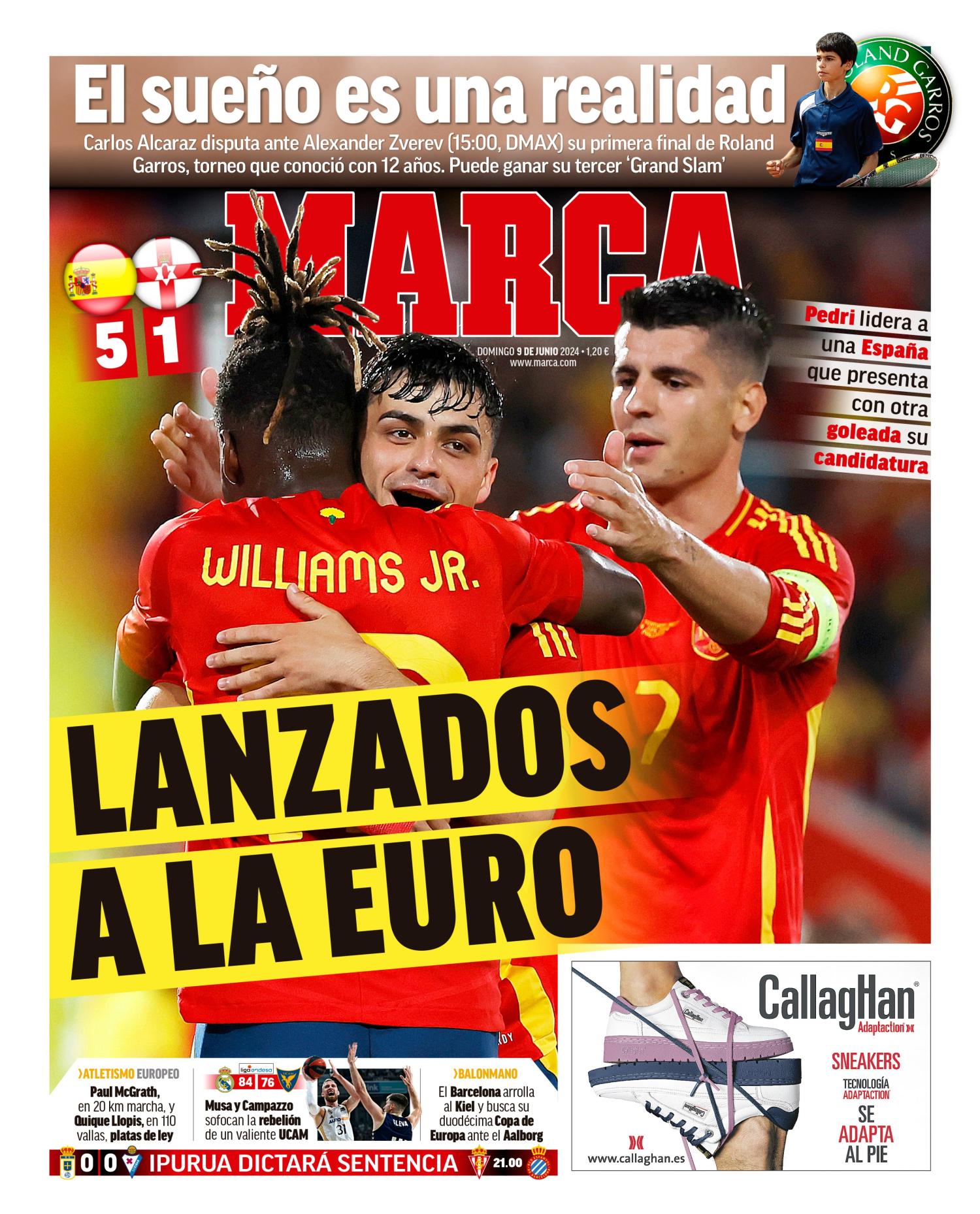 Este domingo 9 de junio de 2024, el diario Marca saca en portada la victoria contundente de España ante Irlanda del Norte (5-1) en el último partido amistoso de 'La Roja' antes de la Eurocopa.