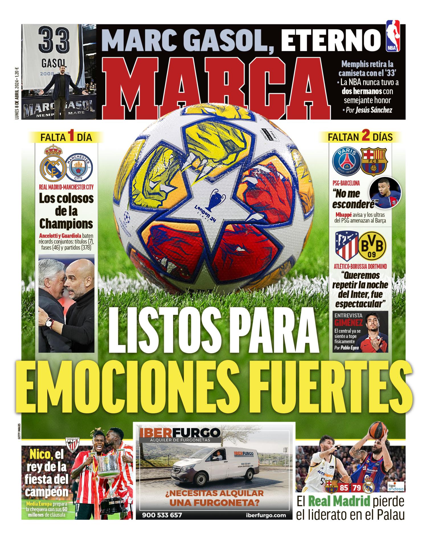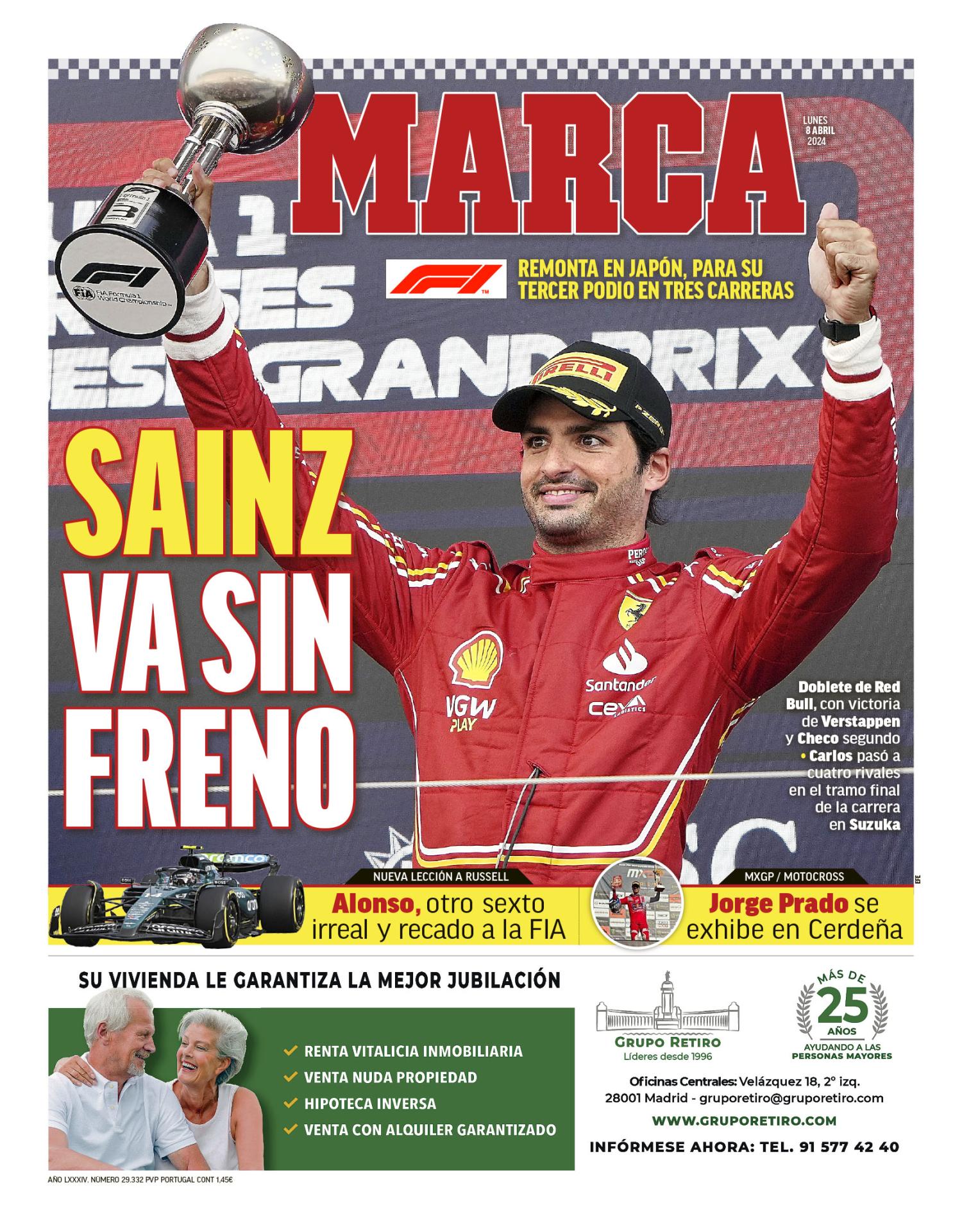 Este lunes 8 de abril de 2024, el diario Marca saca una doble portada: en una de ellas destaca el nuevo podio de Carlos Sainz, y en la otra, el inicio de una apasionante semana de Champions League.