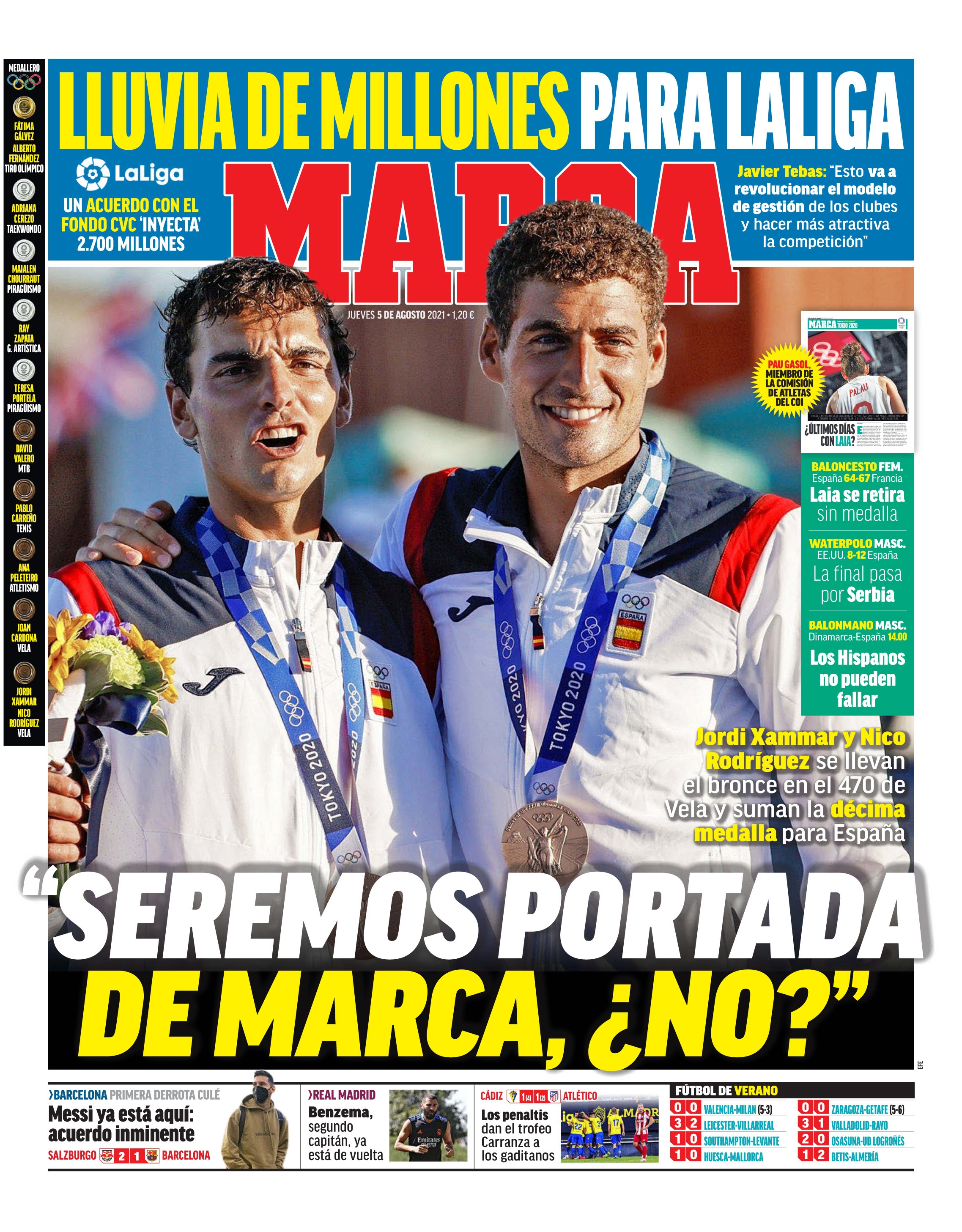 La portada del jueves del diario Marca la protagonizan Jordi Xammar y Nico Rodríguez, que han conseguido la medalla de bronce en el 470 de vela. Por otra parte, el periódico madrileño destaca el regreso de Benzema a los entrenamientos y el acuerdo millonario de LaLiga con el fondo de inversión CVC.