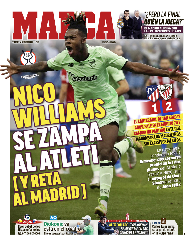 El diario Marca saca en su portada para este viernes la victoria del Athletic frente al Atlético de Madrid y su clasificación para la final de la Supercopa de España. Además, el periódico también destaca la incredulidad del Real Madrid con las valoraciones de Xavi sobre el último clásico. "¿Pero la final quién la juega?", se preguntan en la entidad merengue.
