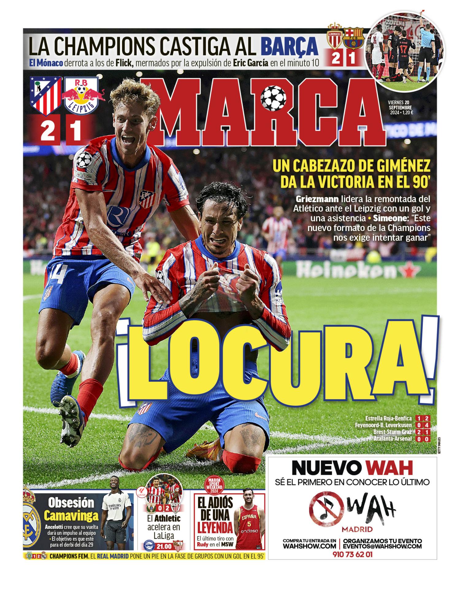 Este viernes 20 de septiembre de 2024, el diario Marca saca en portada la victoria del Atlético de Madrid en su debut en Champions frente al Leipzig, y destaca también el objetivo de Camavinga de llegar completamente recuperado al derbi del próximo 29 de septiembre.