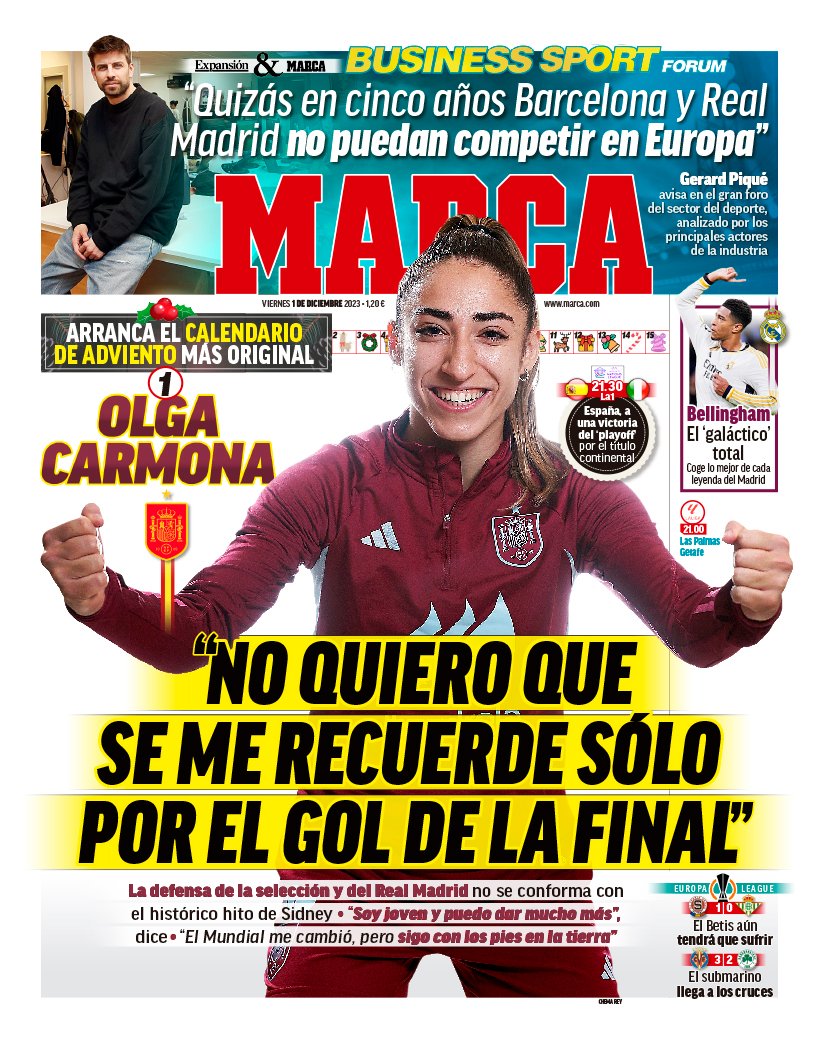Este viernes 1 de diciembre de 2023, el diario Marca saca en portada una entrevista exclusiva con Olga Carmona, futbolista del Real Madrid.