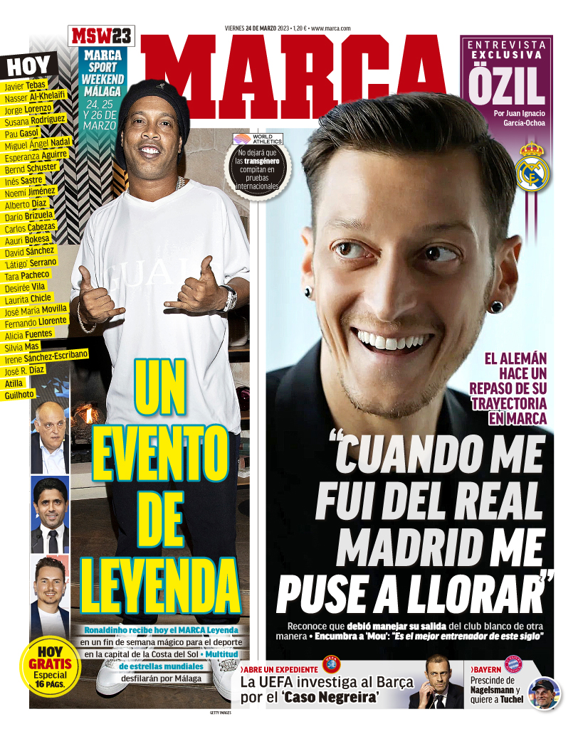 Este viernes 23 de marzo de 2023, el diario Marca saca en portada los detalles de la primera jornada del 'Marca Sport Weekend Málaga' y una entrevista exclusiva con Mesut Özil, quien repasa su trayectoria tras su retirada del fútbol profesional.